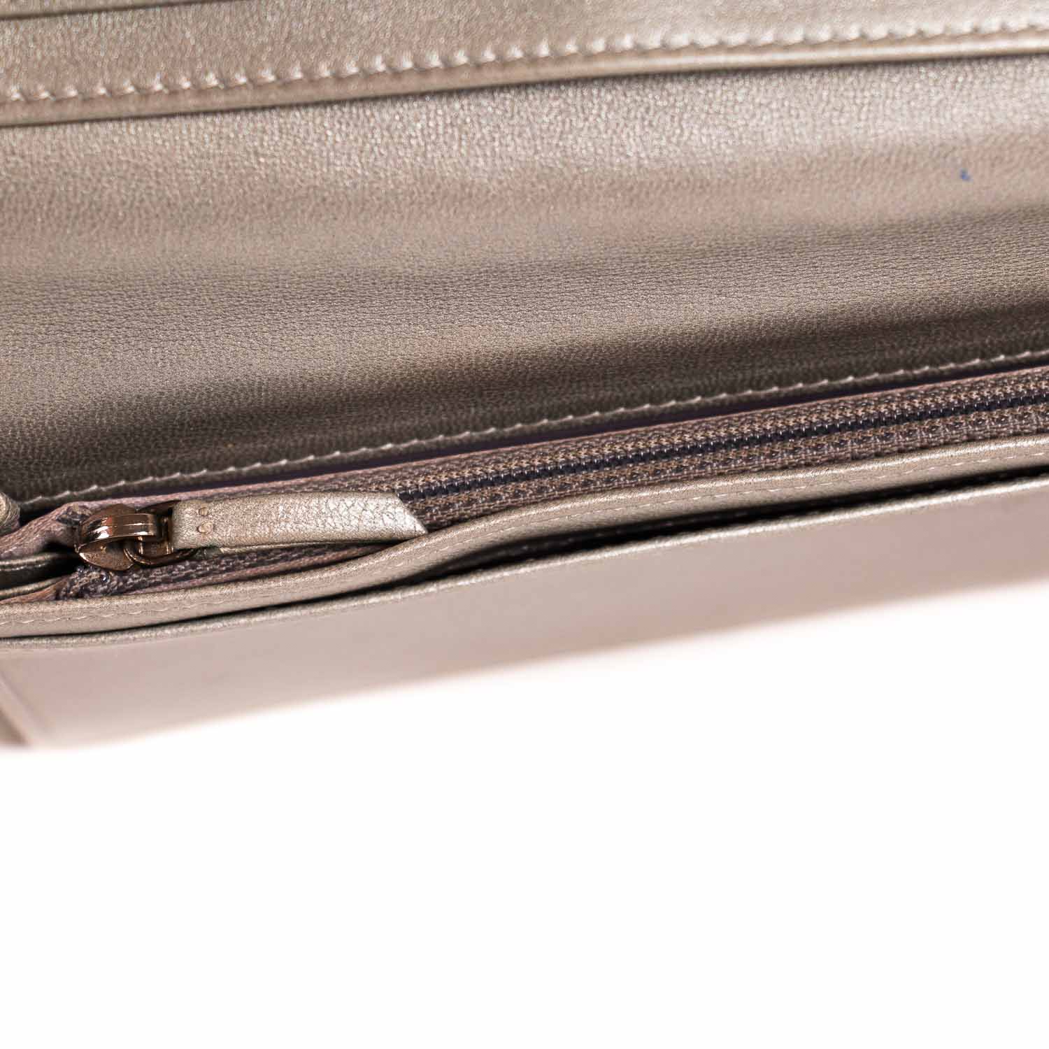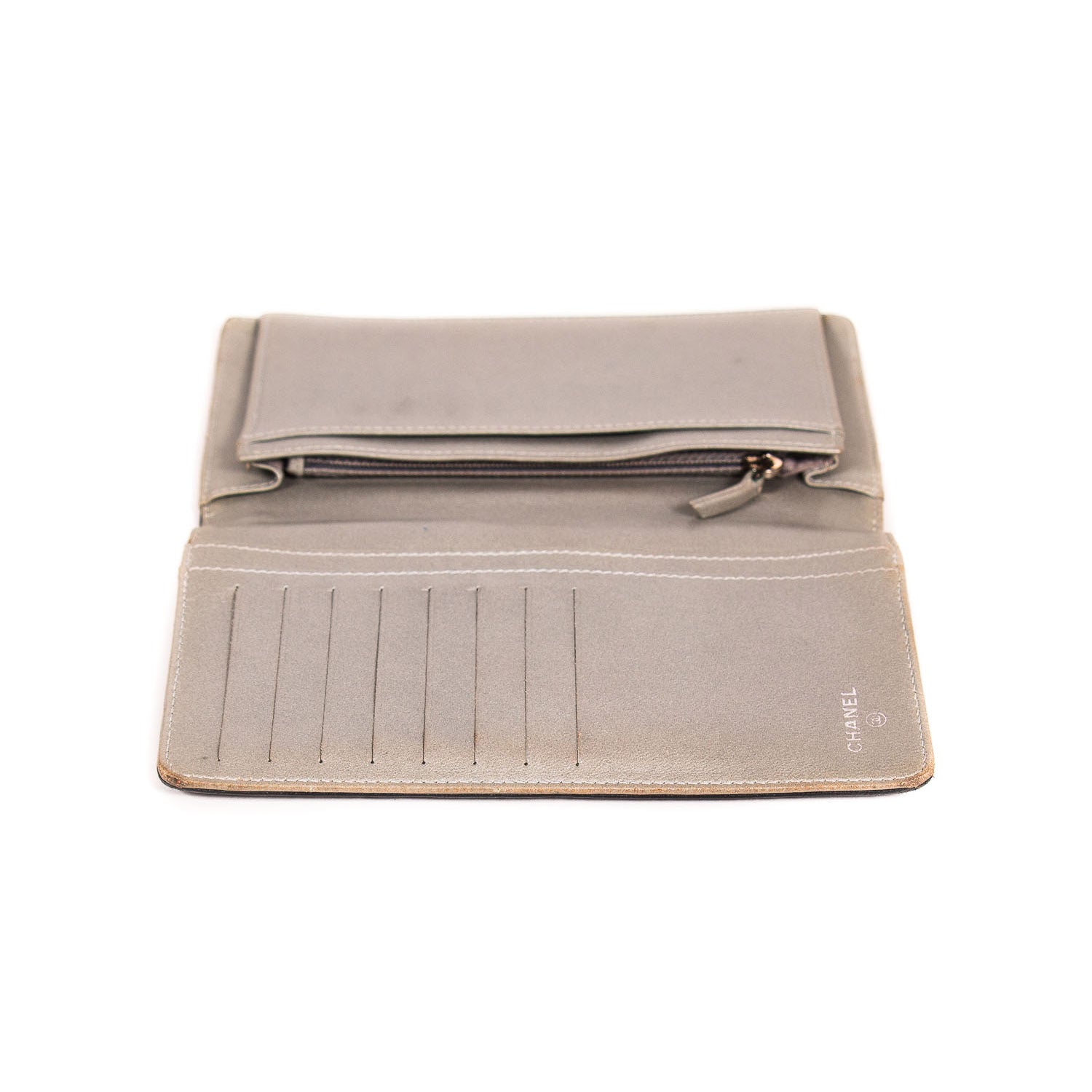 Details: Black Embossed Leather / Silver Tone Hardware / Interlocking CC At Front Face / Grey Leather Interior With Satin Lining / Eight Card Slots / Six Compartments One With Zip Closure / Fold Closure