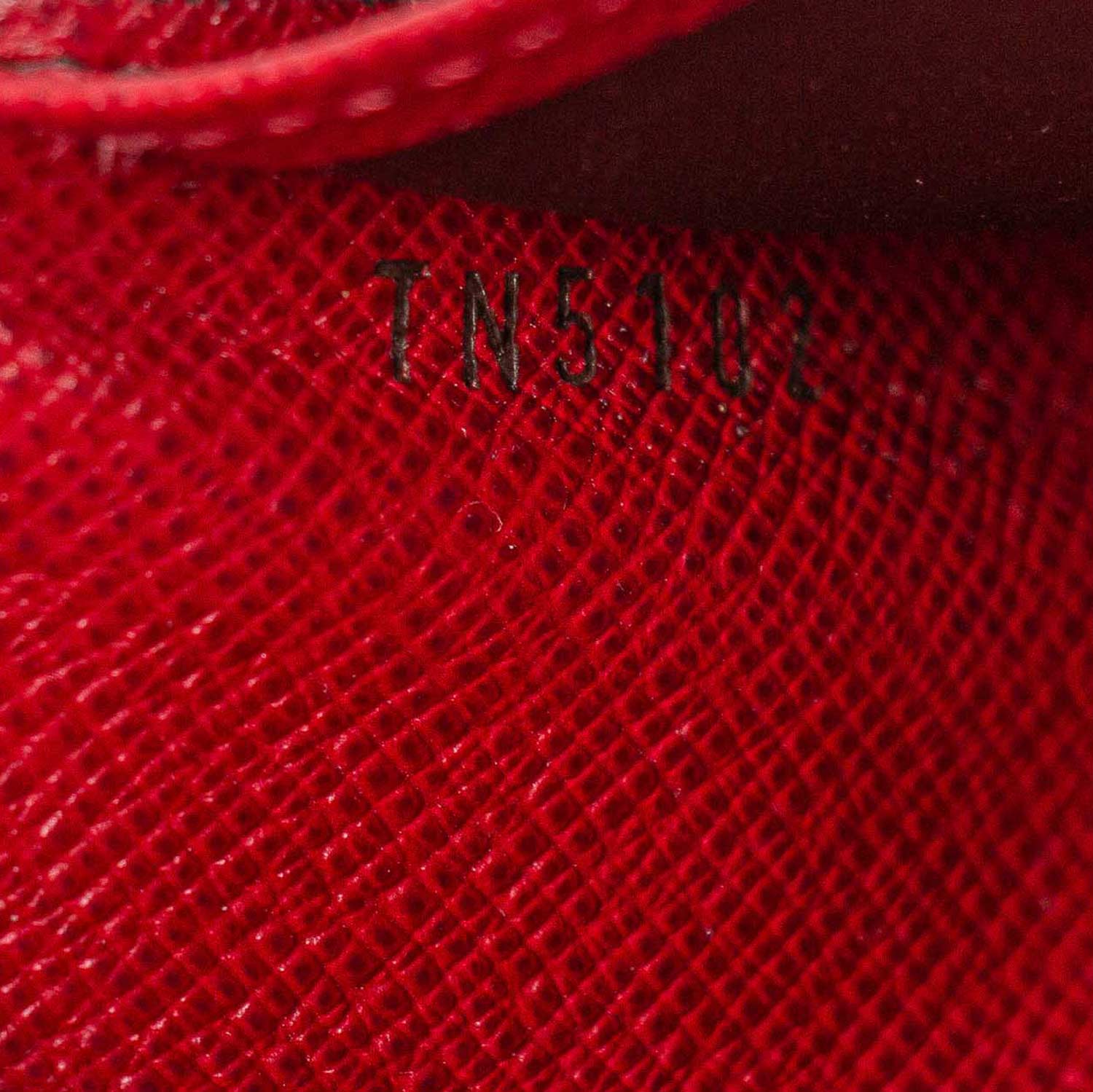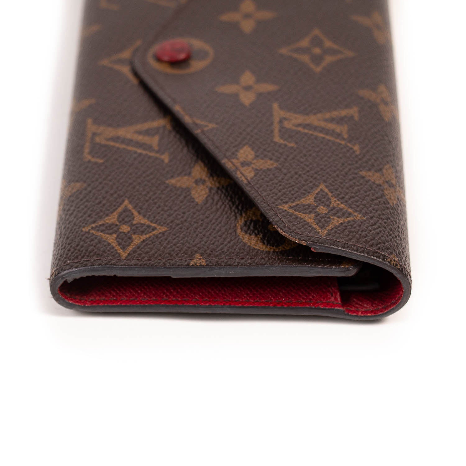 Details: Brown Monogram and Red Coated Canvas / Leather Trimming / Four Card Slots /  Removable Zip Pocket / Bill ID and Notes Compartment / Stud Closure at Front