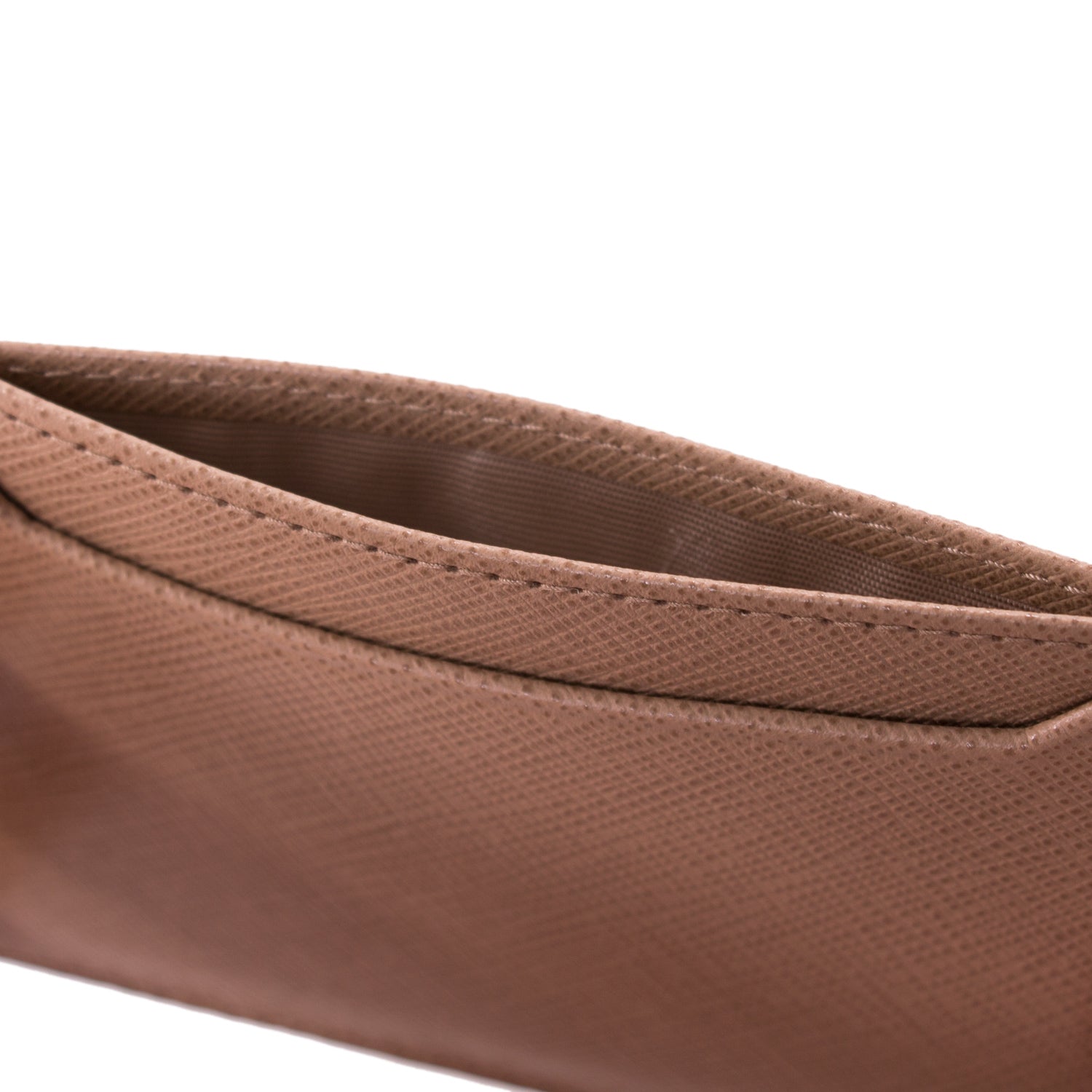 Details: Tan Saffiano Leather / Gold-Tone Hardware / Logo at Front / Two-Card Compartment / Centre Slot Compartment