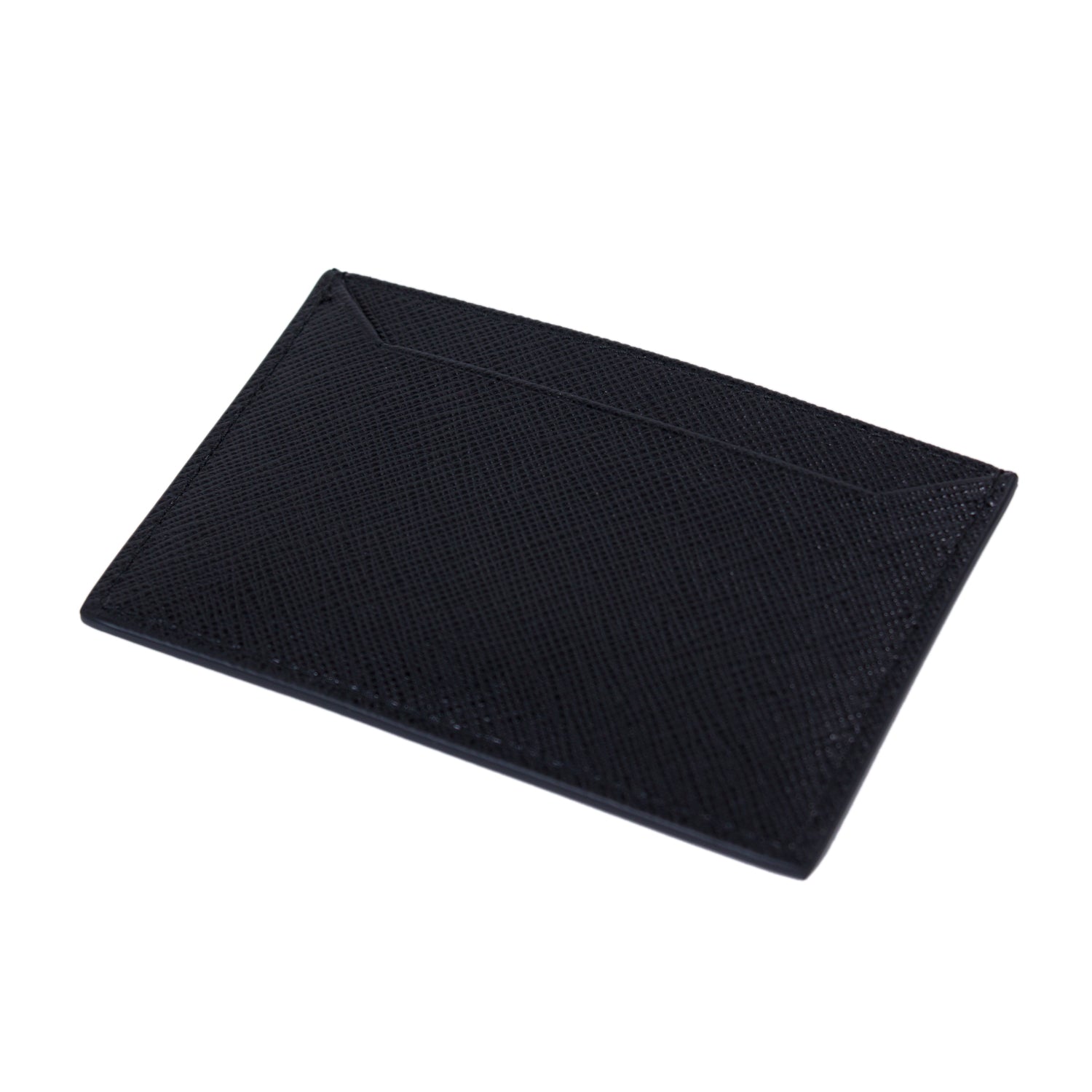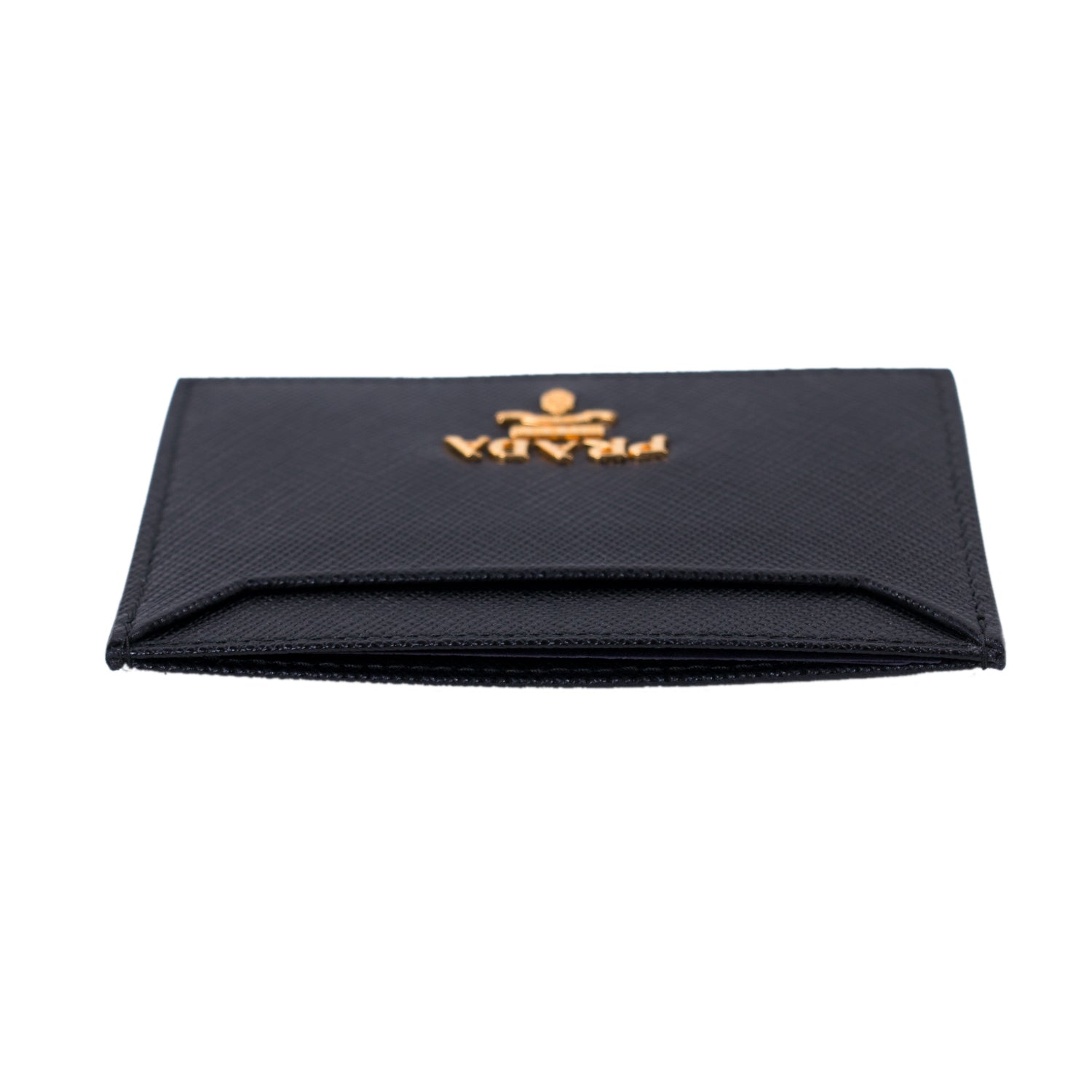Details: Black Saffiano Leather / Gold-Tone Hardware / Logo at Front / Two-Card Compartment / Centre Slot Compartment