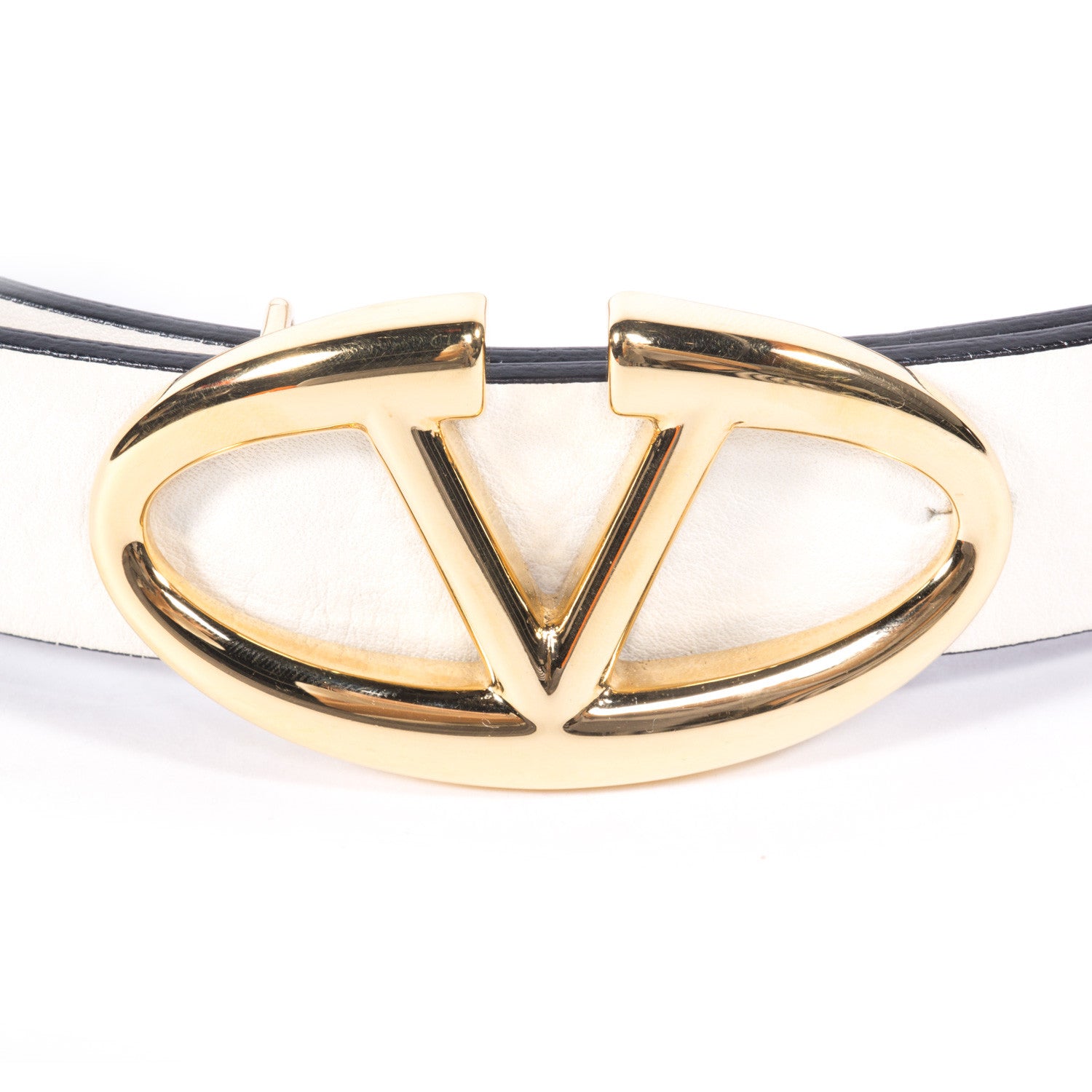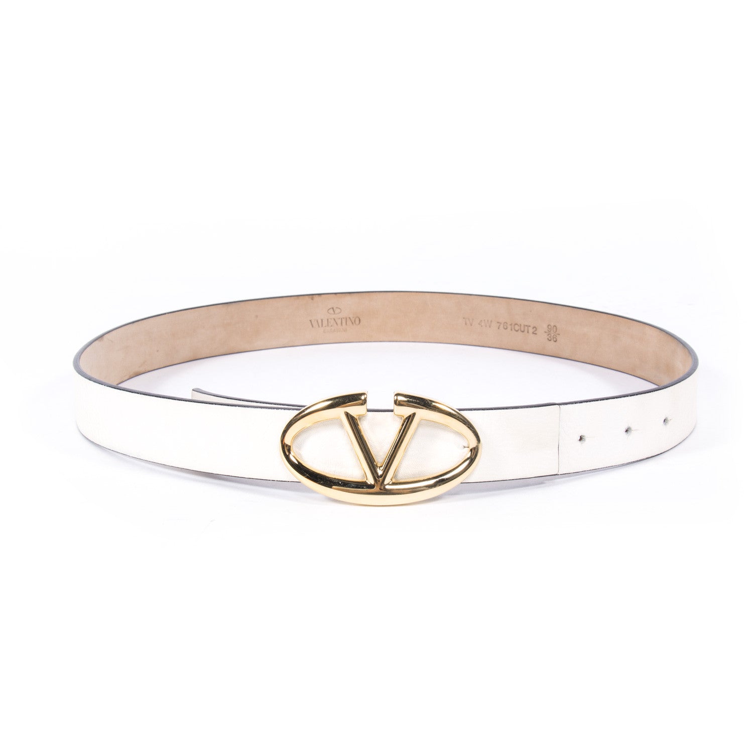 Details: White Leather Valentino / Tonal Stitching /  Gold-Tone Hardware / V Accent Logo Buckle / Peg-In-Hole Closure