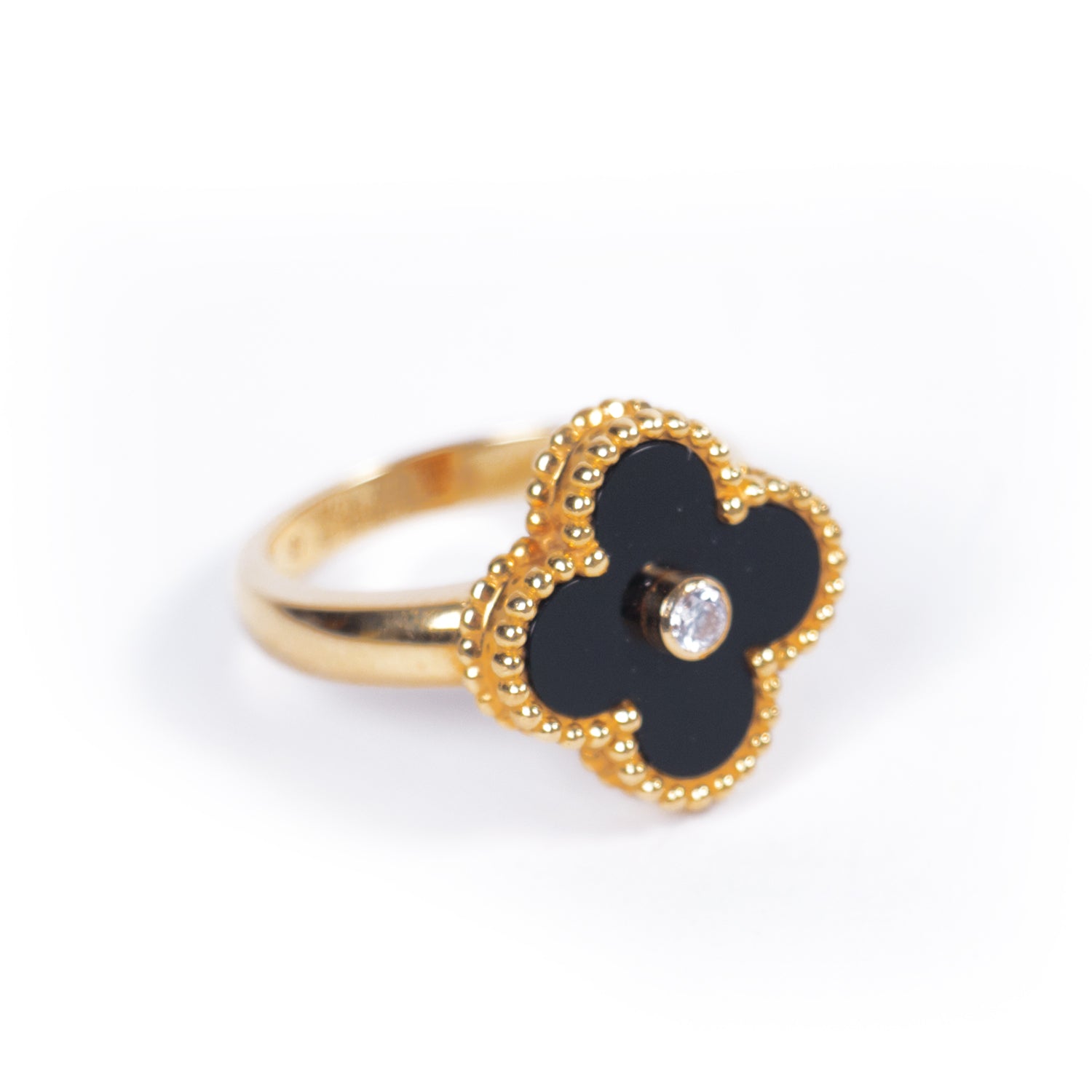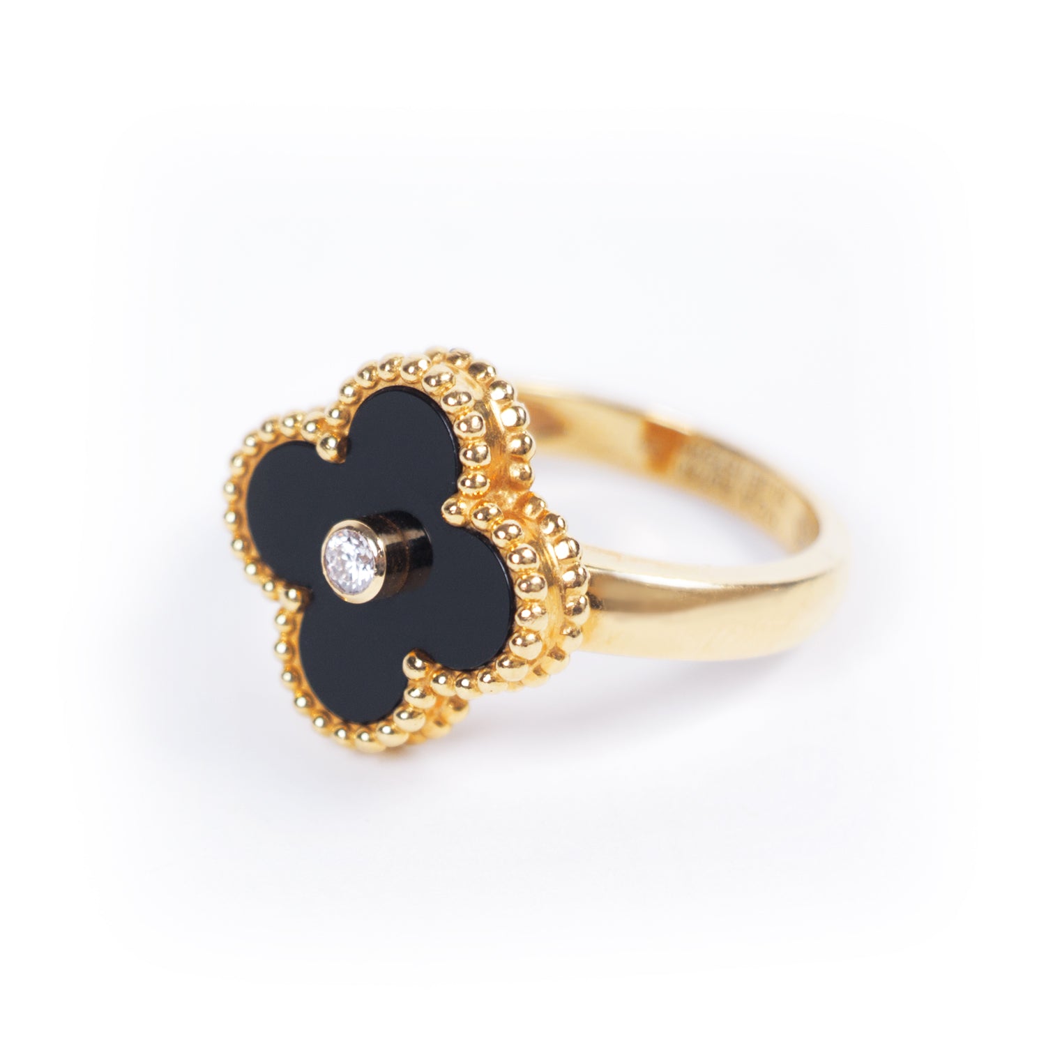 Details: 18K Yellow Gold / One Diamond Stone / One Onyx Stone / Clover Leaf Shape