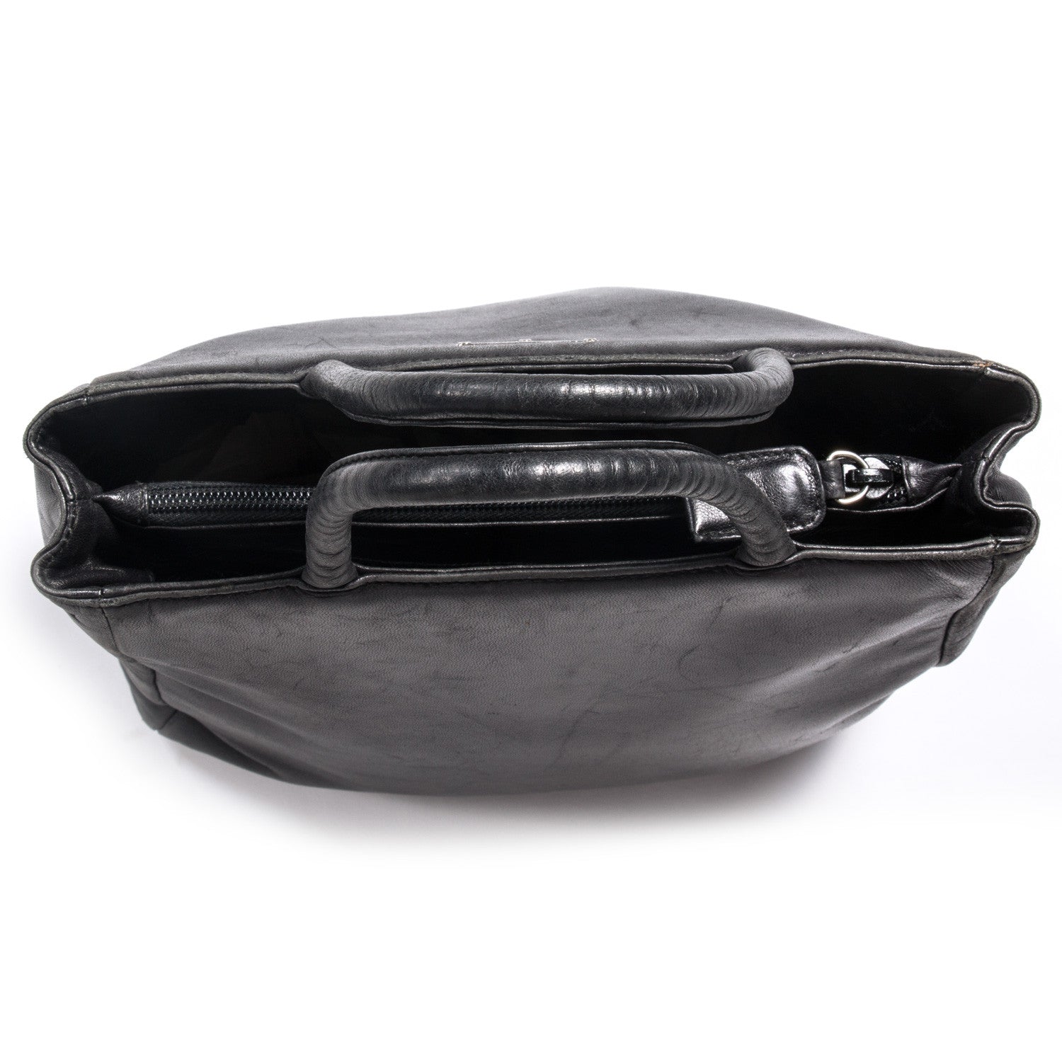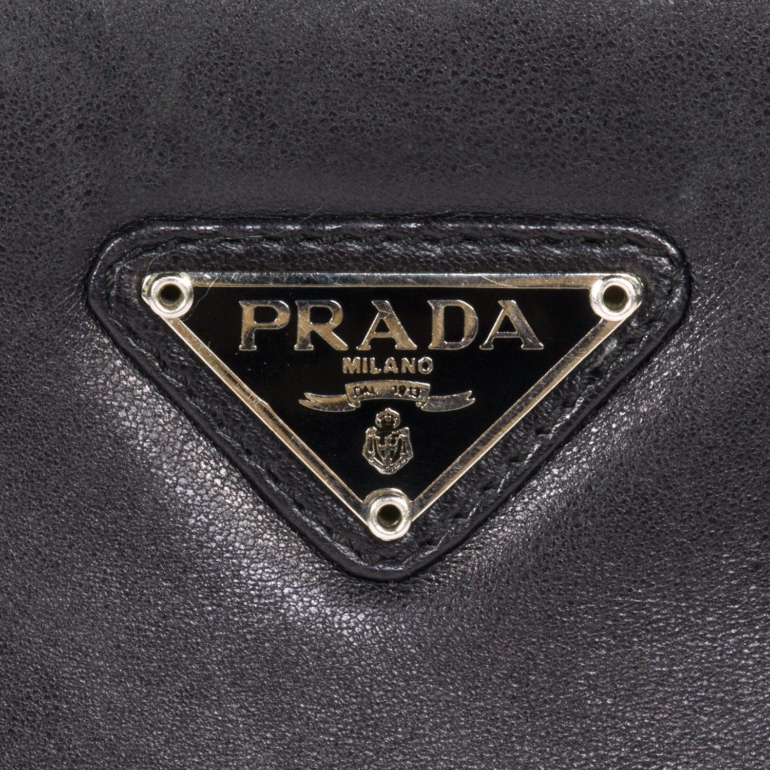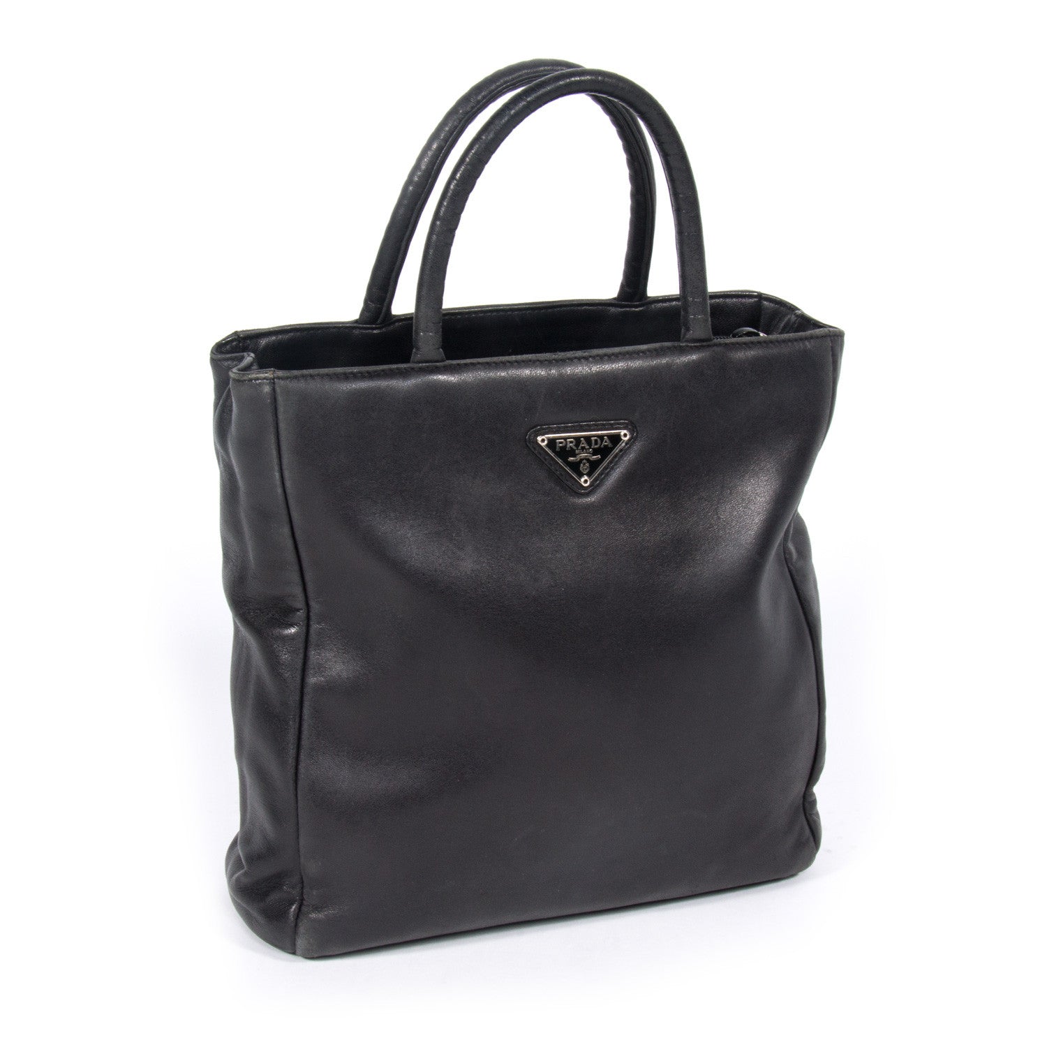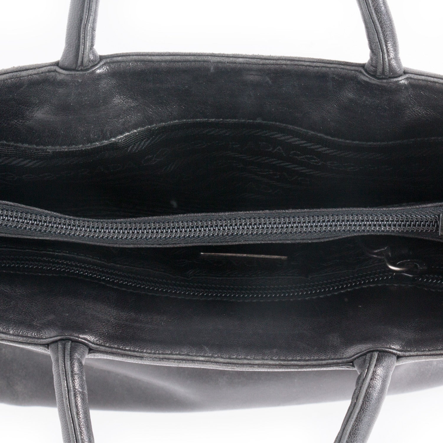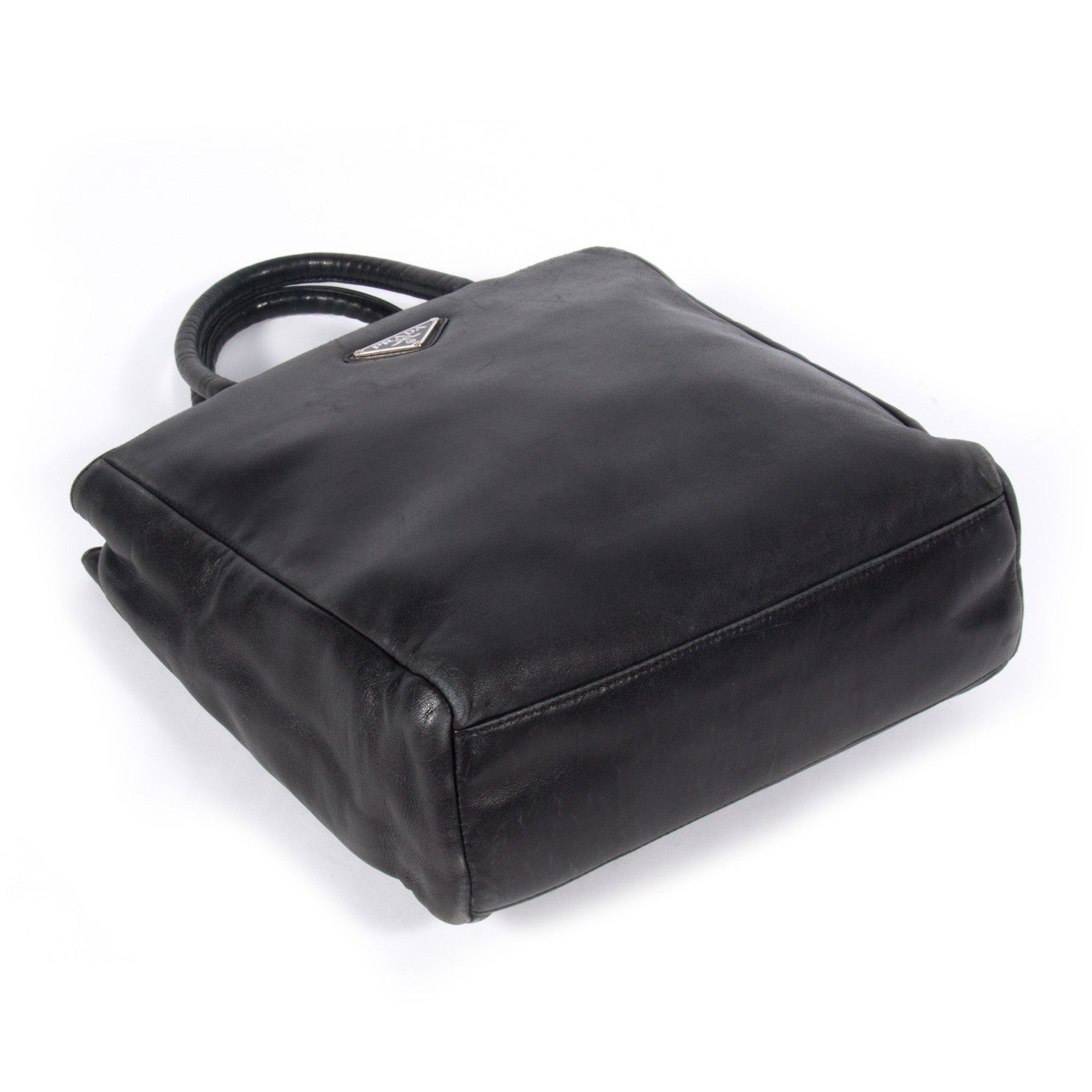 Details: Black Prada Tote / Silver Tone Hardware / Tonal Stitching / Logo At Front / Dual Rolled Top Handles / Black Logo Print Woven Lining / Three Compartment, One / Zipper Pocket At Interior Wall
