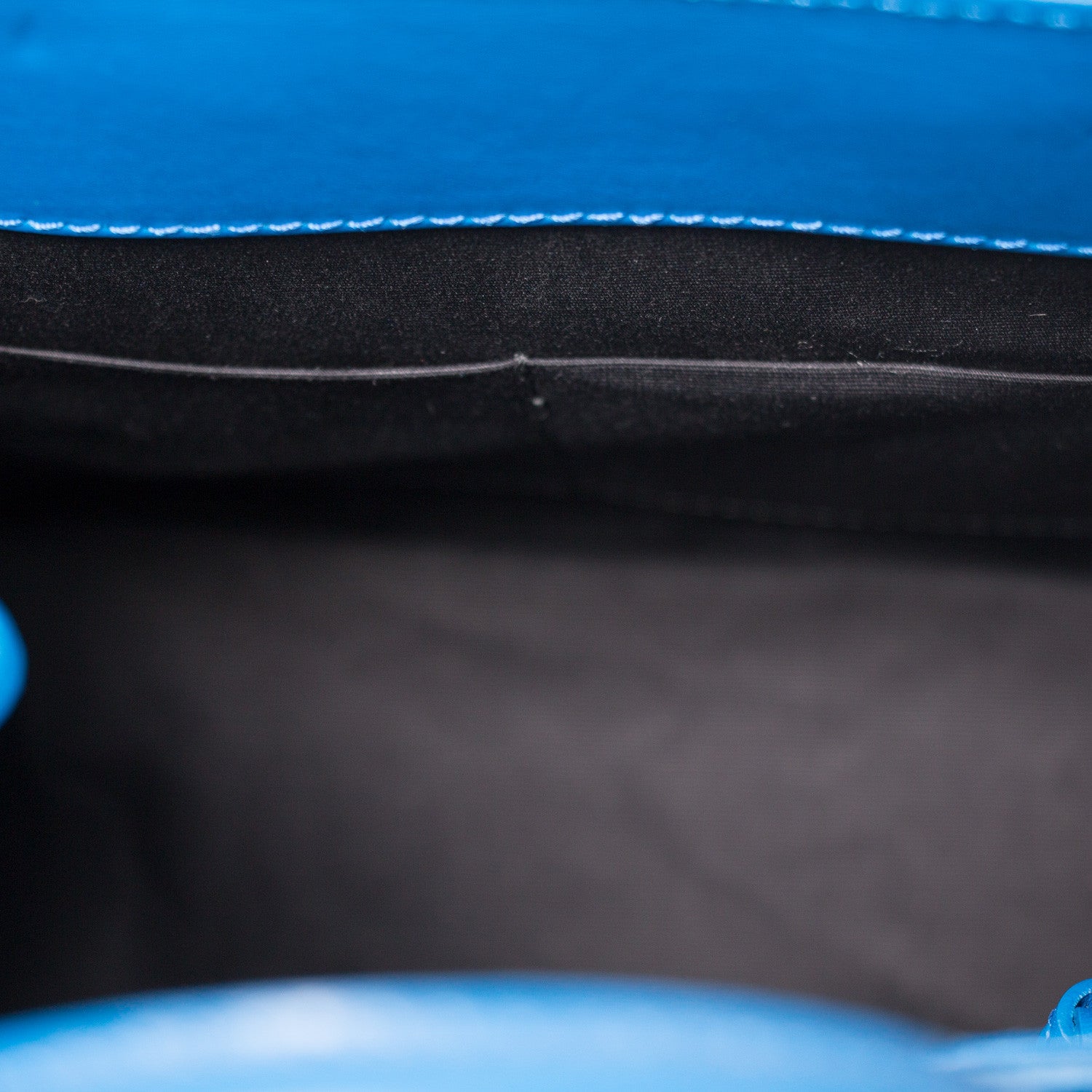 Details: Blue Sleek Calf Leather / Silver-Tone Hardware / Dual Rolled Handles / Detachable Adjustable Shoulder Strap / Fastening Buckles At Sides / Logo On Marble Plate At Front / Black Interior Woven Lining / Dual Pockets At Interior Walls, One with Zipper Closure / Attached Clochette, Key Holder and Mirror