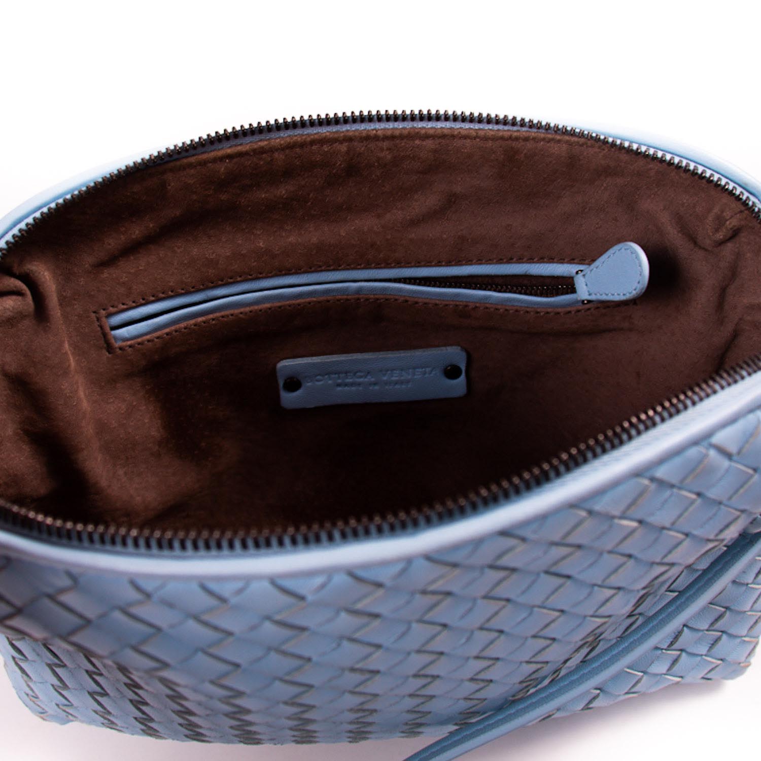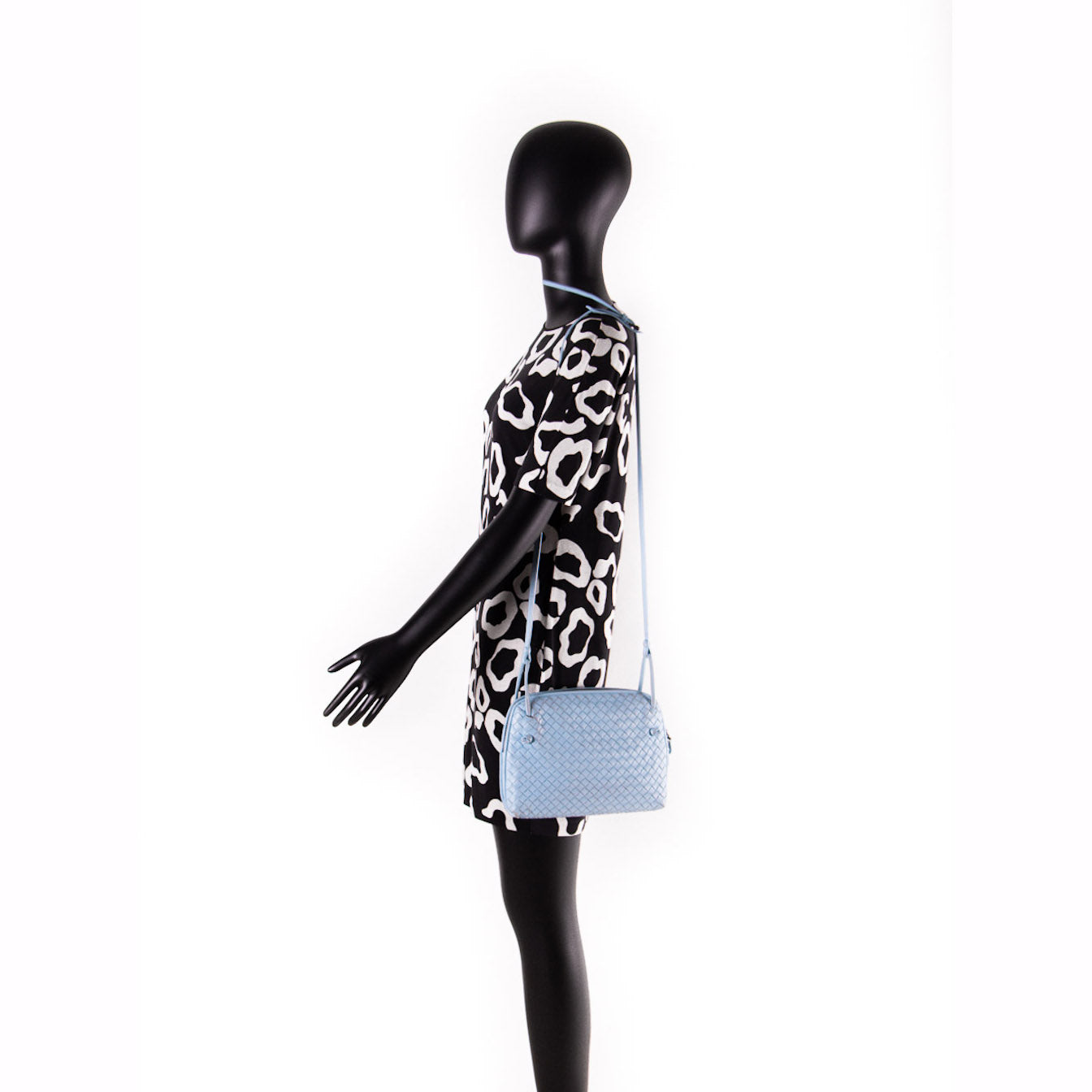 Details: Sky Blue Intrecciato Leather / Black Metal Hardware / Long Adjustable Shoulder Strap / Brown Suede Lining / Zipper and Flat Pocket at Interior / Dual-Way Zipper Closure at Top
