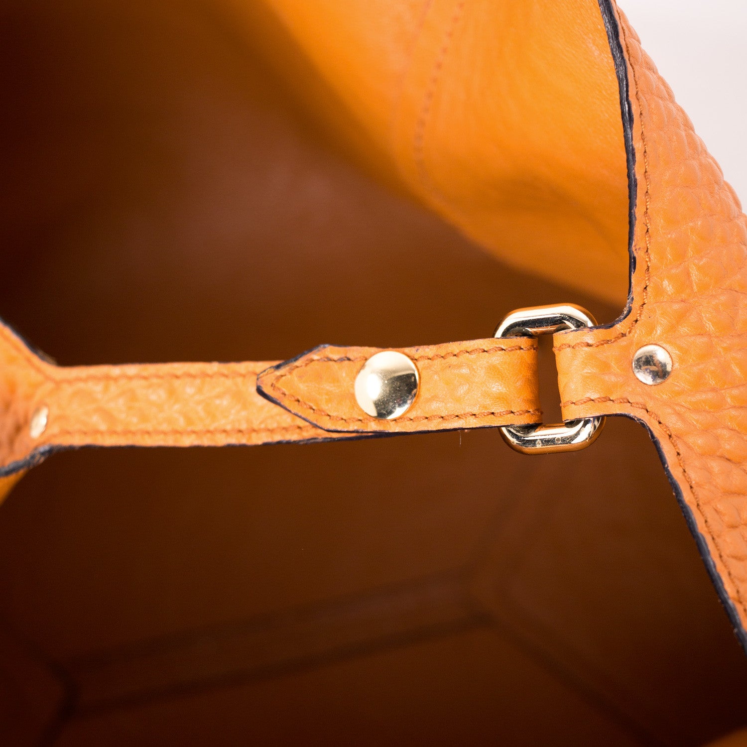 Details: Camel Embossed Check Grain Leather / Gold Tone Hardware / Dual Flat Shoulder / Protective Studs at Base / Leather Lining at Interior / Large Compartment / Magnetic Snap Closure / Detachable Zip Pouch