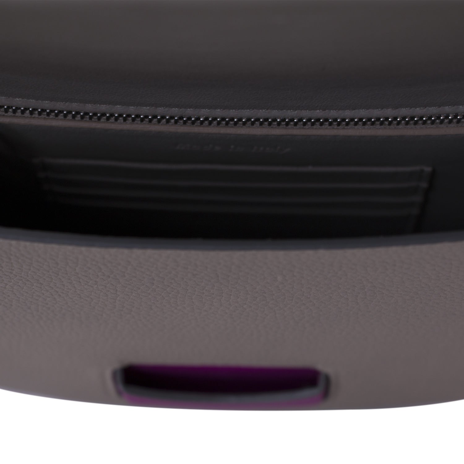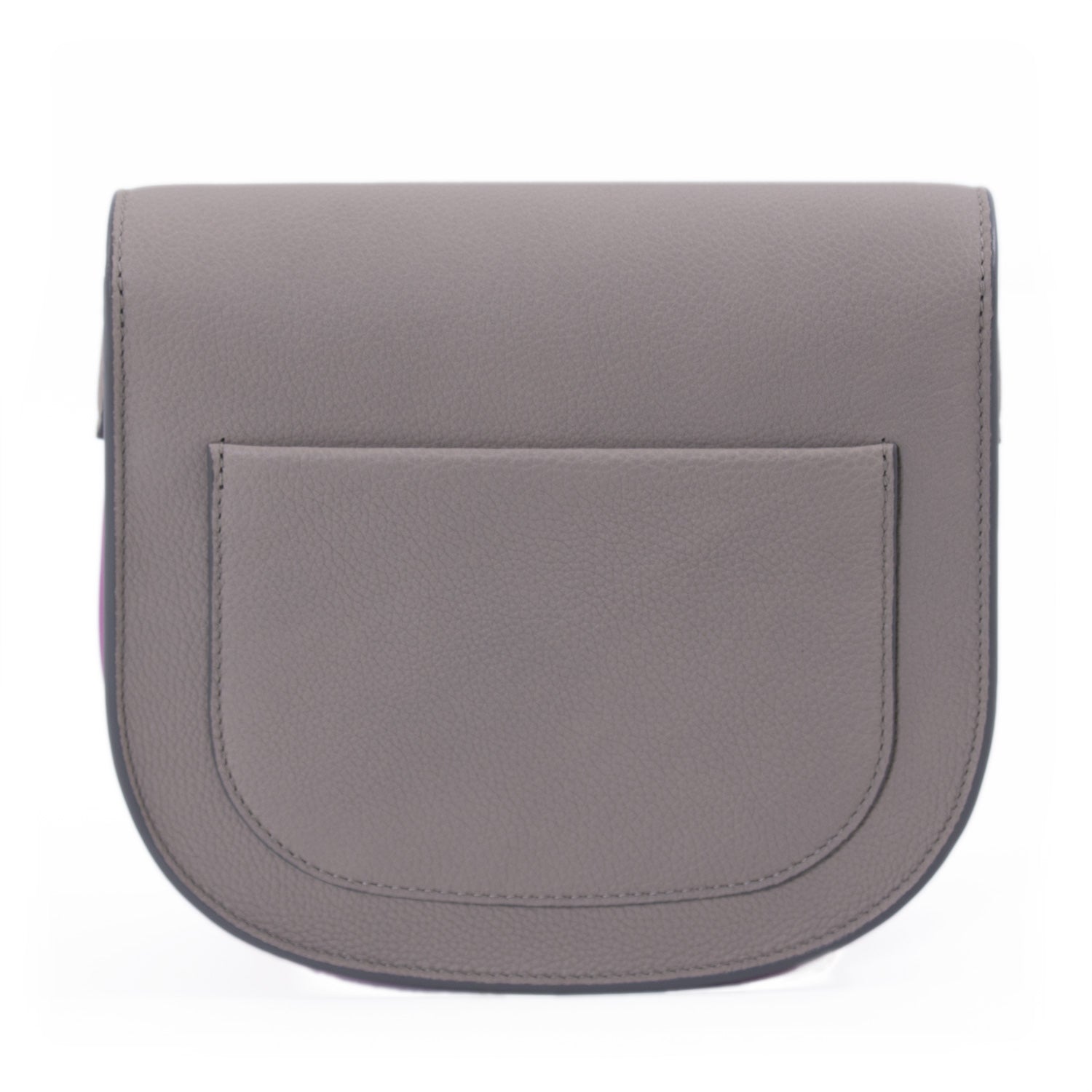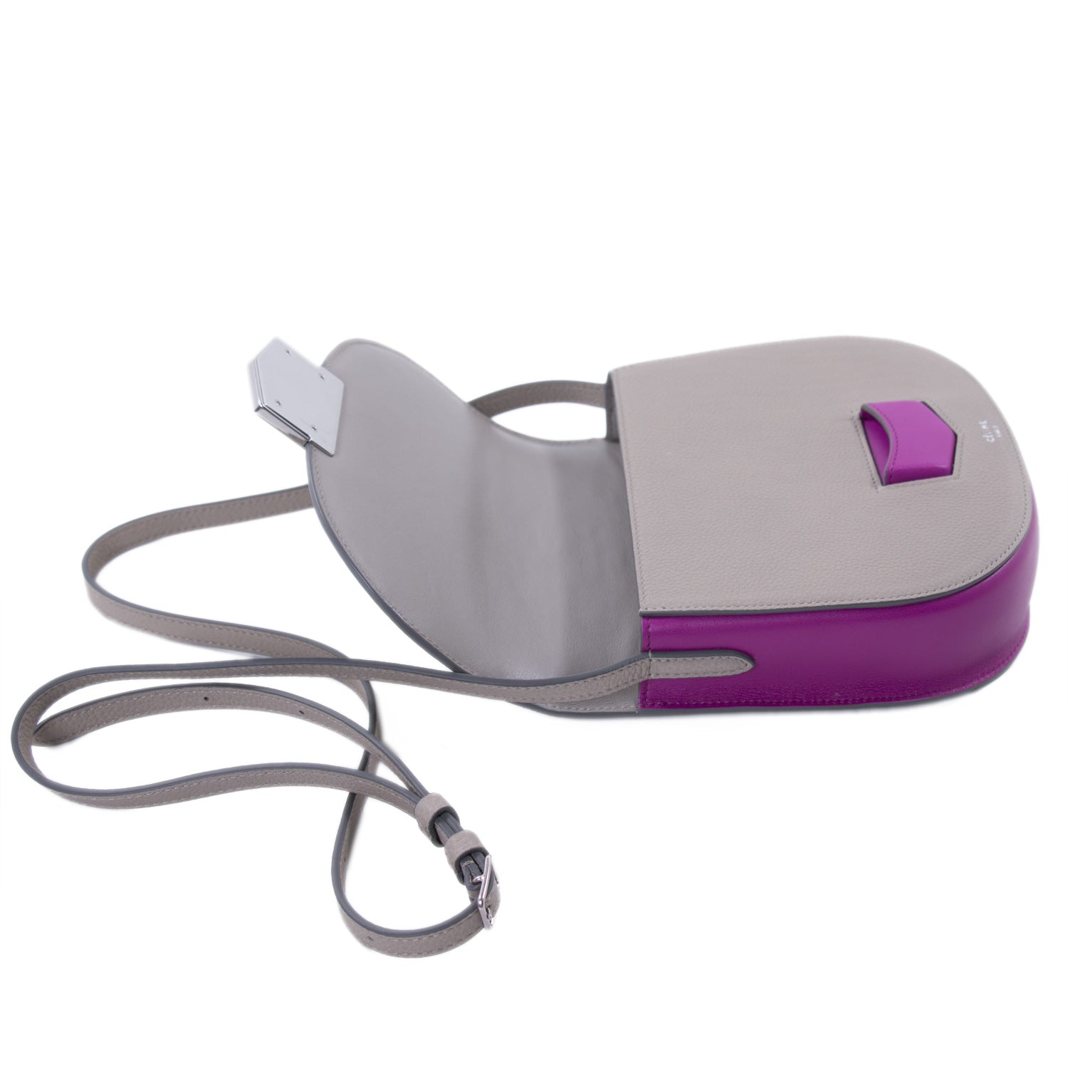Details: Grey and Magneto Grained Leather / Silver Hardware / Adjustable Shoulder Strap / Exterior Pocket at Back / Zipper Pocket at 4 Card Slots at Interior / Fold-in Flap Closure at Front