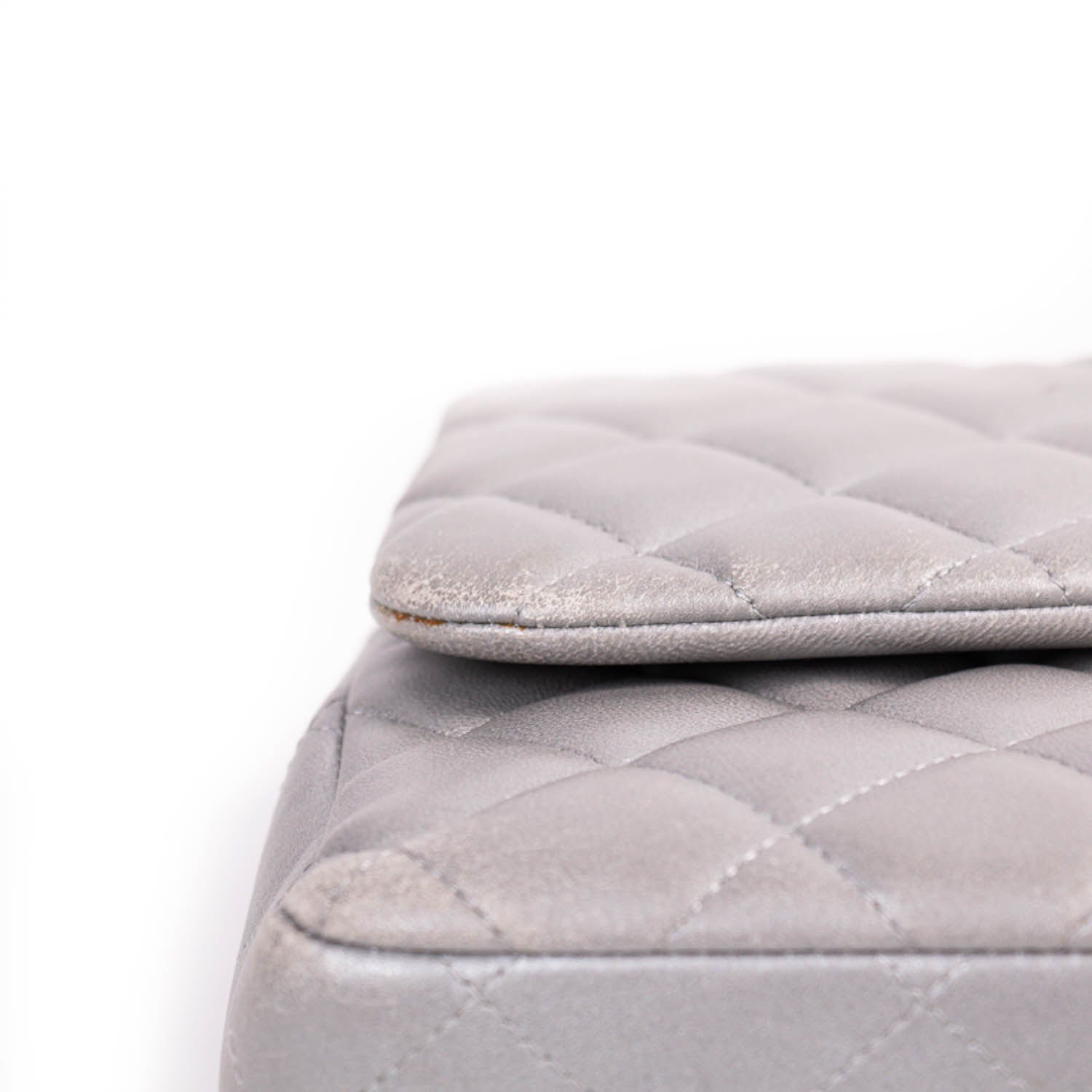 Details: Grey Calfskin Leather / Brushed Silver-Tone Hardware / Chain-Link and Leather Shoulder Strap / Silver Leather Lining / Dual Compartments with Two Flat Pockets at Inside / Turn Lock Closure at Front Flap
