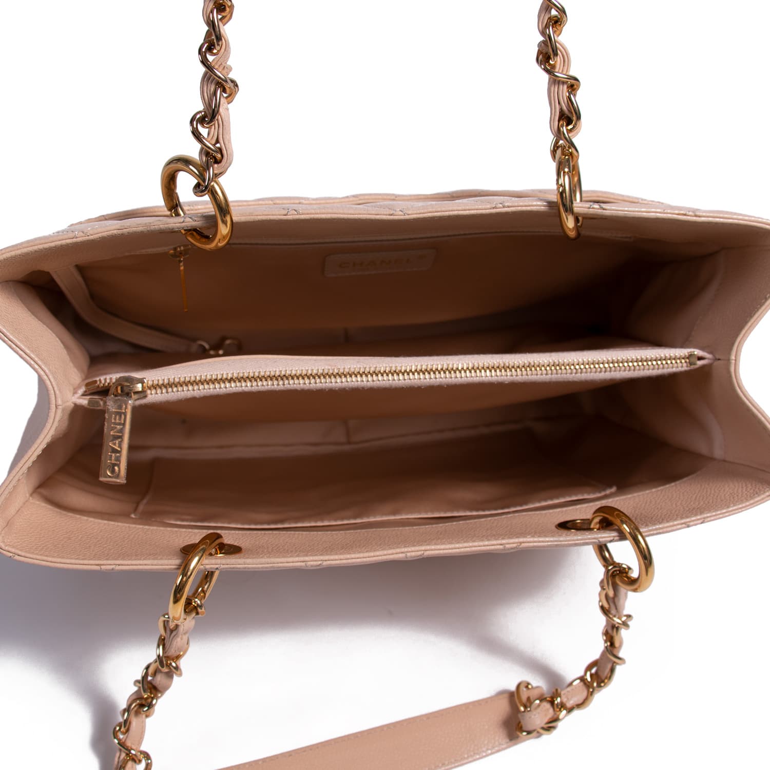 Details: Nude Caviar Leather / Gold-Tone Hardware / Dual Rolled Chain-Link and Leather Shoulder Strap / Flat Pocket at Exterior Back / Dual Compartments Separated by a Zipper Pocket / Zipper and Flat Pocket at Inside Wall / Open Top