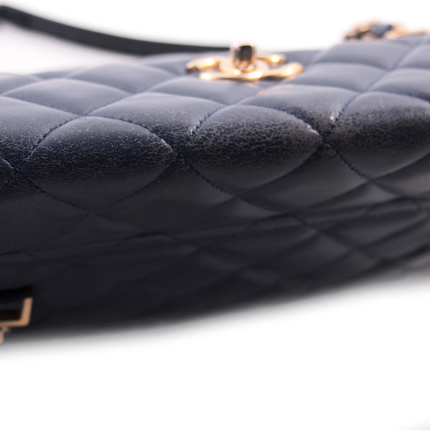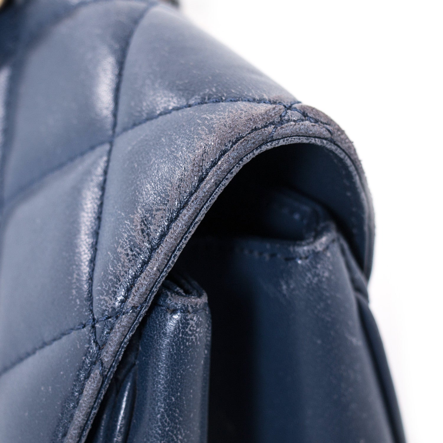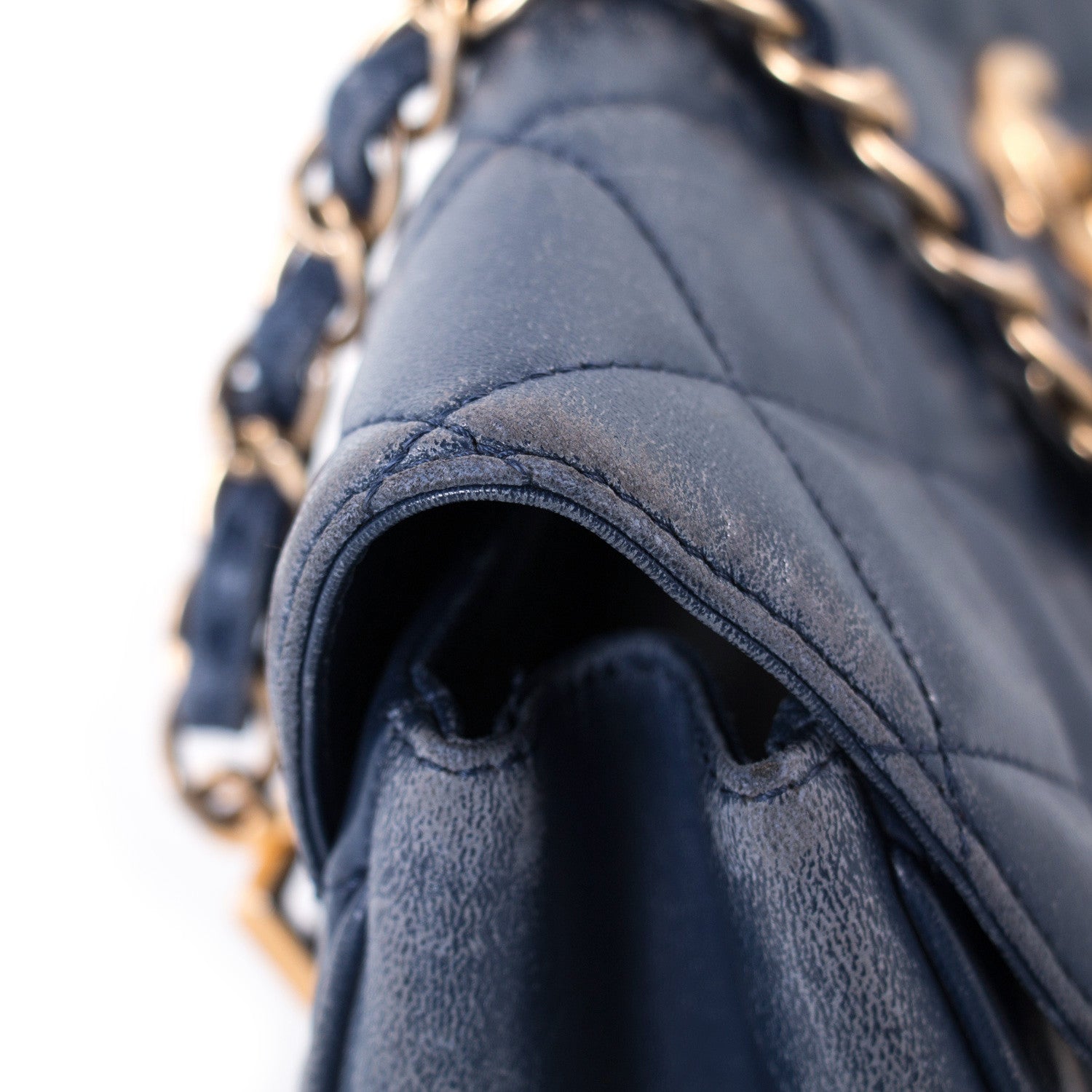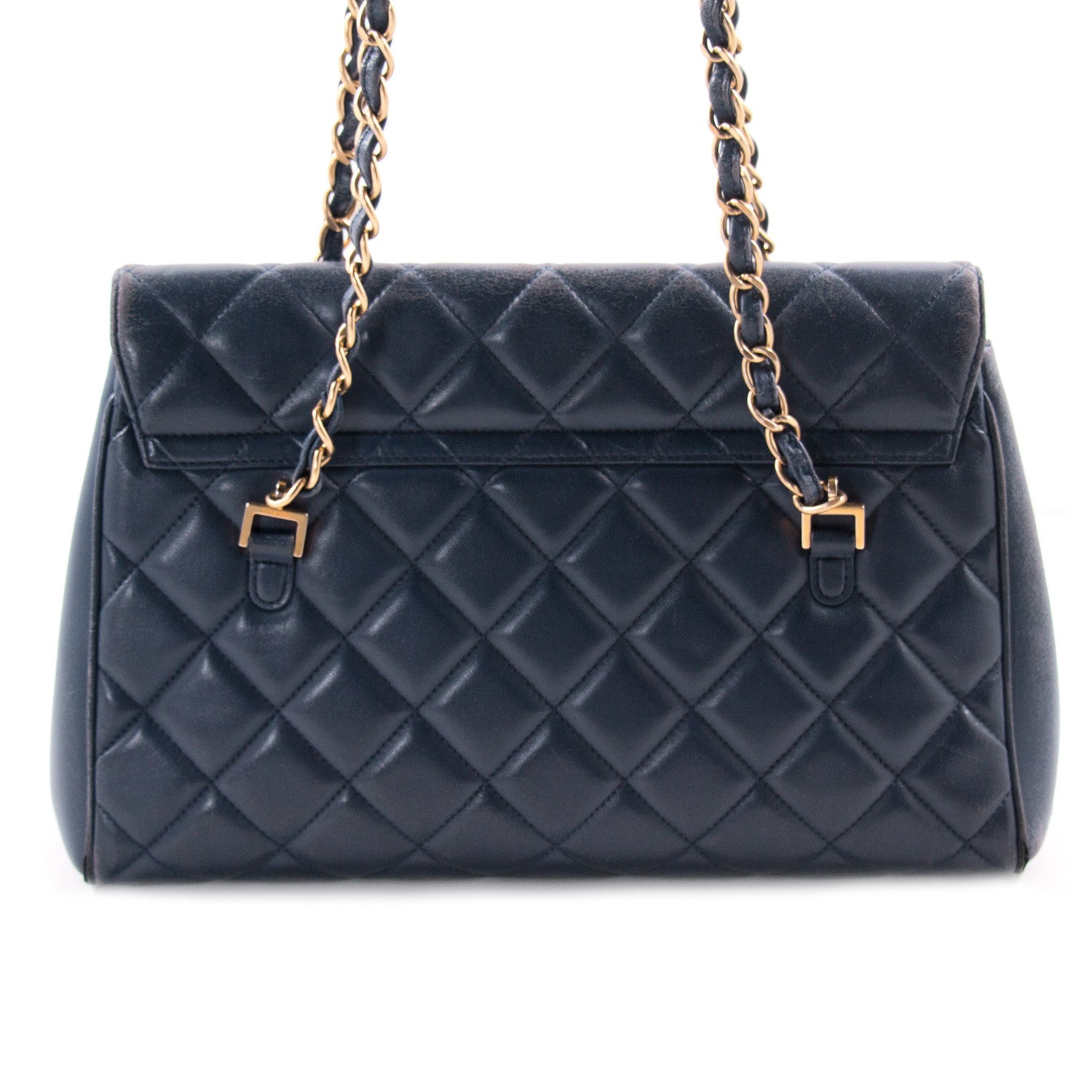 Details: Navy Blue Lambskin Leather / Gold Tone Hardware / Two Separate Chain-Link Shoulder Straps With Leather Pads / Blue Leather Interior Lining / Single Zip Pocket and Dual Flat Pocket at Interior / Turn-Lock Closure at Front Flap