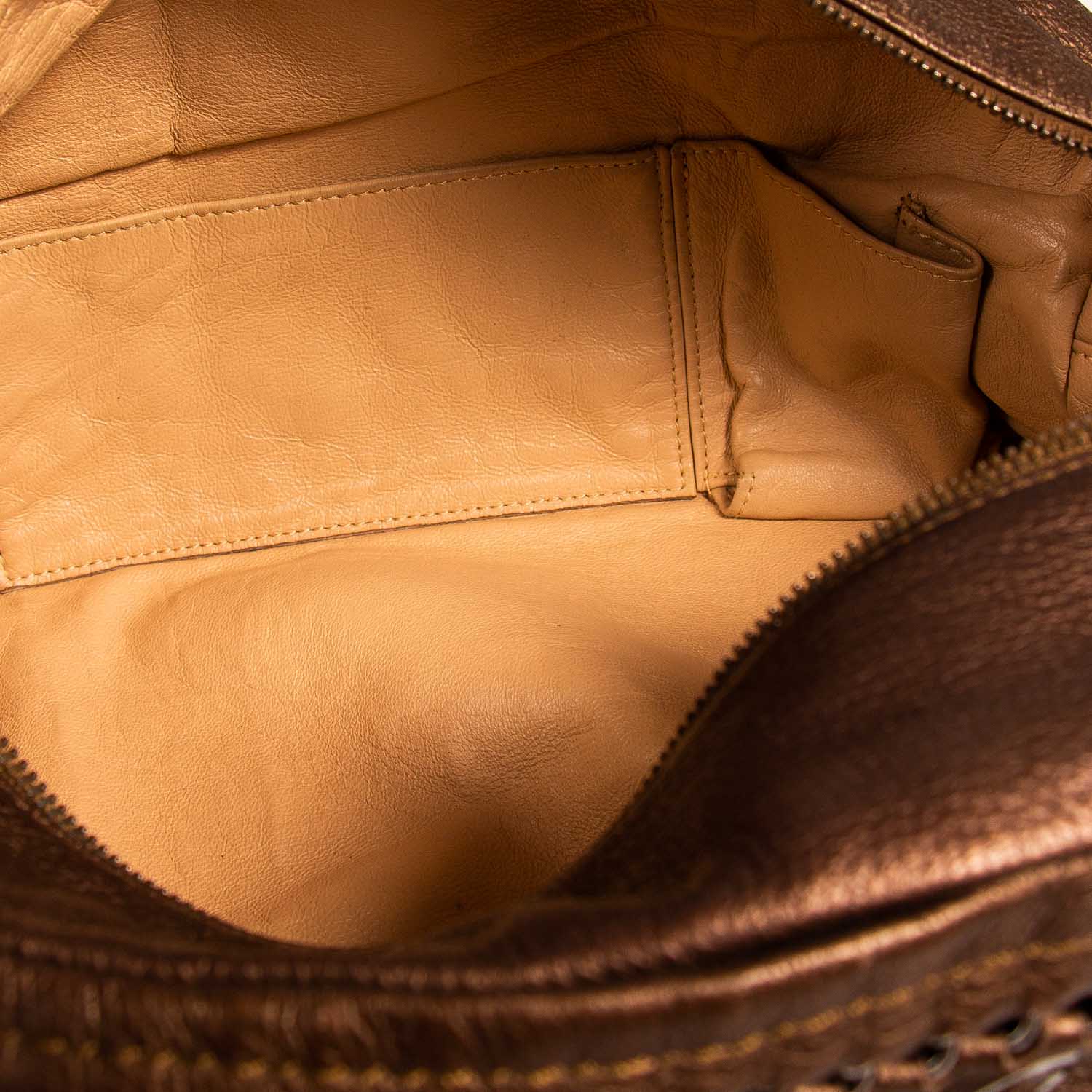 Details: Dark Bronze Structured Leather / Silver-Tone Hardware / Braided Leather and Chain Shoulder Strap / Tonal Stitching / Logo At Front / Chain Link Accent at Front and Back / Beige Leather Interior Lining / Three Pockets at Interior Walls, One With Zip Closure / Zipper Closure at Top