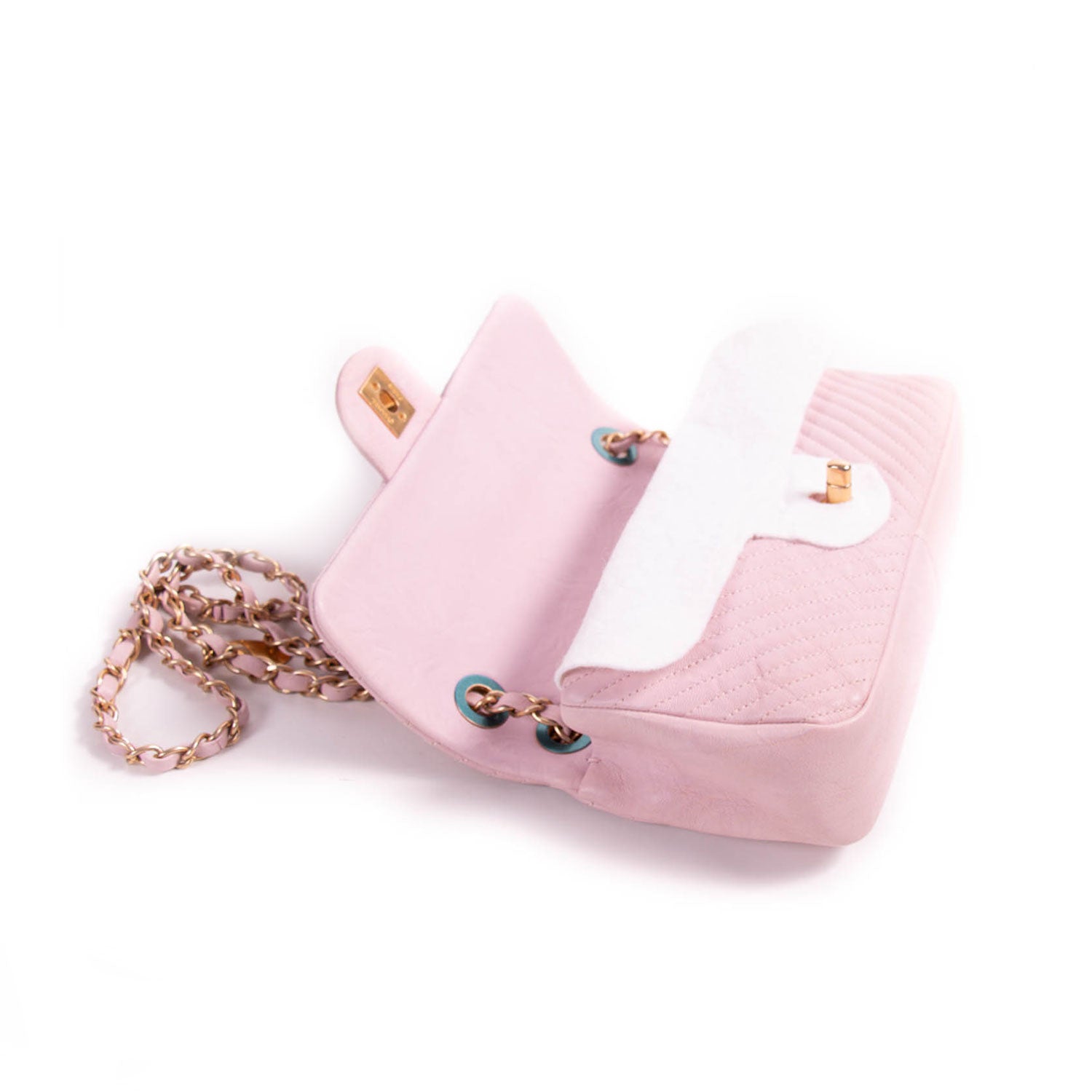 Description: Pink Chevron Quilted Leather / Gold-Tone Hardware / Chain-Link and Leather Shoulder Strap / Single Compartment / Black Fabric Lining / Single Slit Pocket at Inside / Turn-Lock Closure at Front Flap