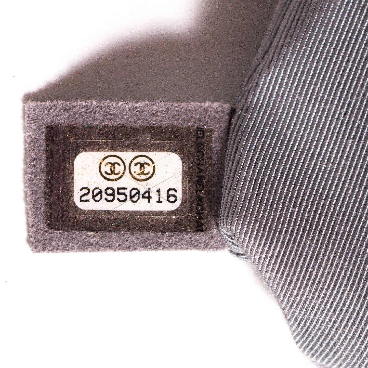 Details: Black Patent Leather / Antiqued Silver Hardware / White Vertical Stitching Pattern / Dual Chain Shoulder Strap With Black Leather Pad / Grey Fabric Interior Lining / Three Compartments / Zip Closure at Interior Wall / CC Turn Lock Closure at Front Flap