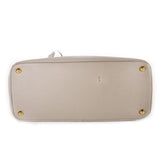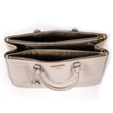 Details: Etaupe Saffiano Leather / Gold-Tone Hardware / Double Rolled Handles / Tonal Beige Jacquard Interior Lining / Three Large Compartments, Two With Zip Closure / Dual Slit Pockets At Interior Wall And Zip Pocket At Opposite Wall / Clasp Closure At Edges / Logo At Front Exterior / Key Chain Tethered At Handle
