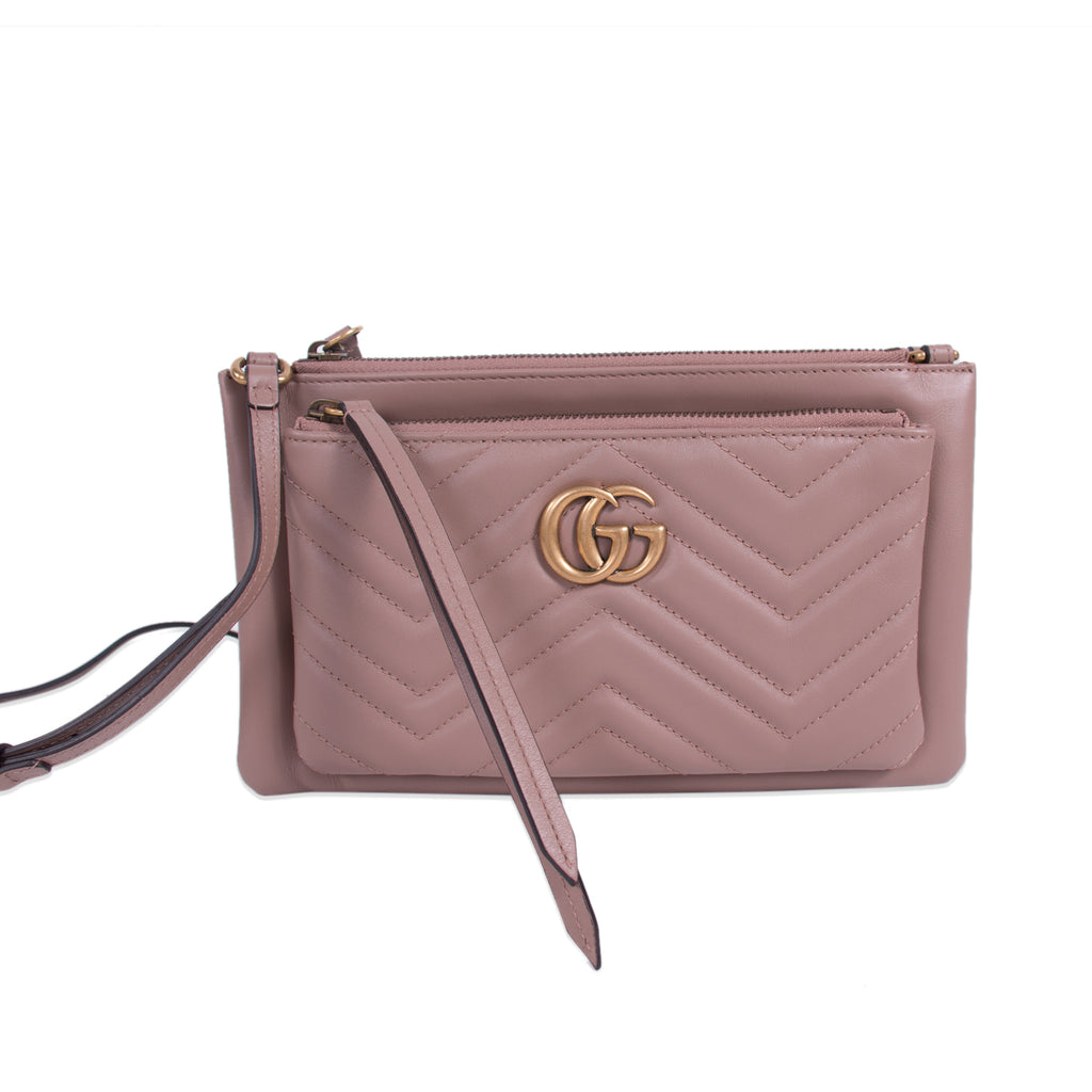 Details: Pale Pink Leather / Brushed Gold-Tone Hardware / Adjustable Shoulder Strap / Detachable Pouch / Fabric Interior / Zipper Closure at Top