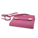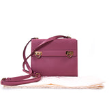 Details: Purple Grained Leather / Gold-Tone Hardware / Adjustable Shoulder Strap / Exterior Zipper Pocket at Back / Chocolate Leather Lining / Three Interior Compartments, One with Zip Closure / Dual Gancio Flip-Lock Closure at Front