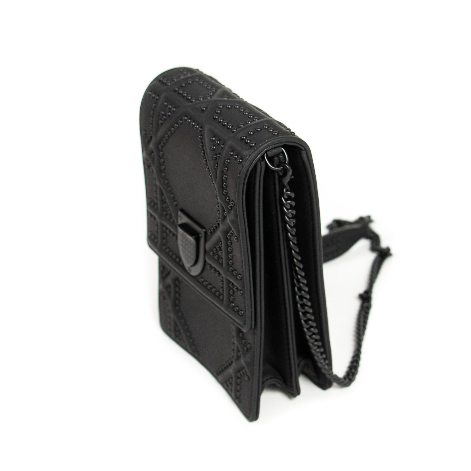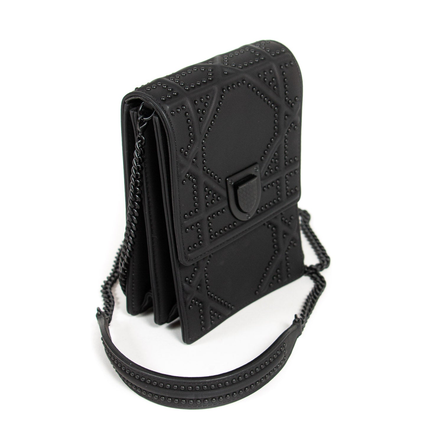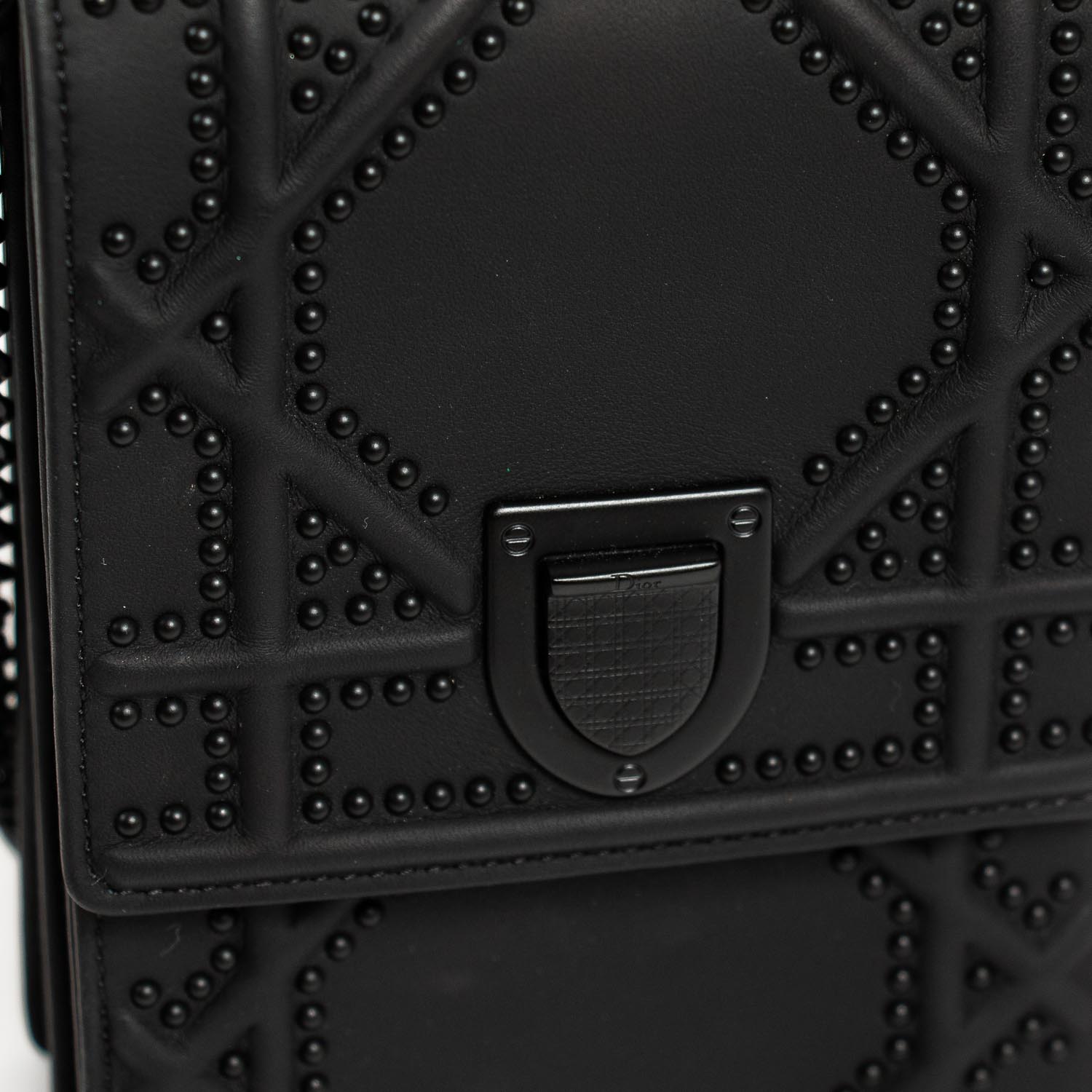Details: Black Embossed Calfskin Leather / Black Hardware / Detachable Chain with Leather Pad Shoulder Strap / Studs Throughout the Exterior / Black Suede Interior Lining / Dual Slit Pocket at Interior / Magnetic Closure at Front Flap