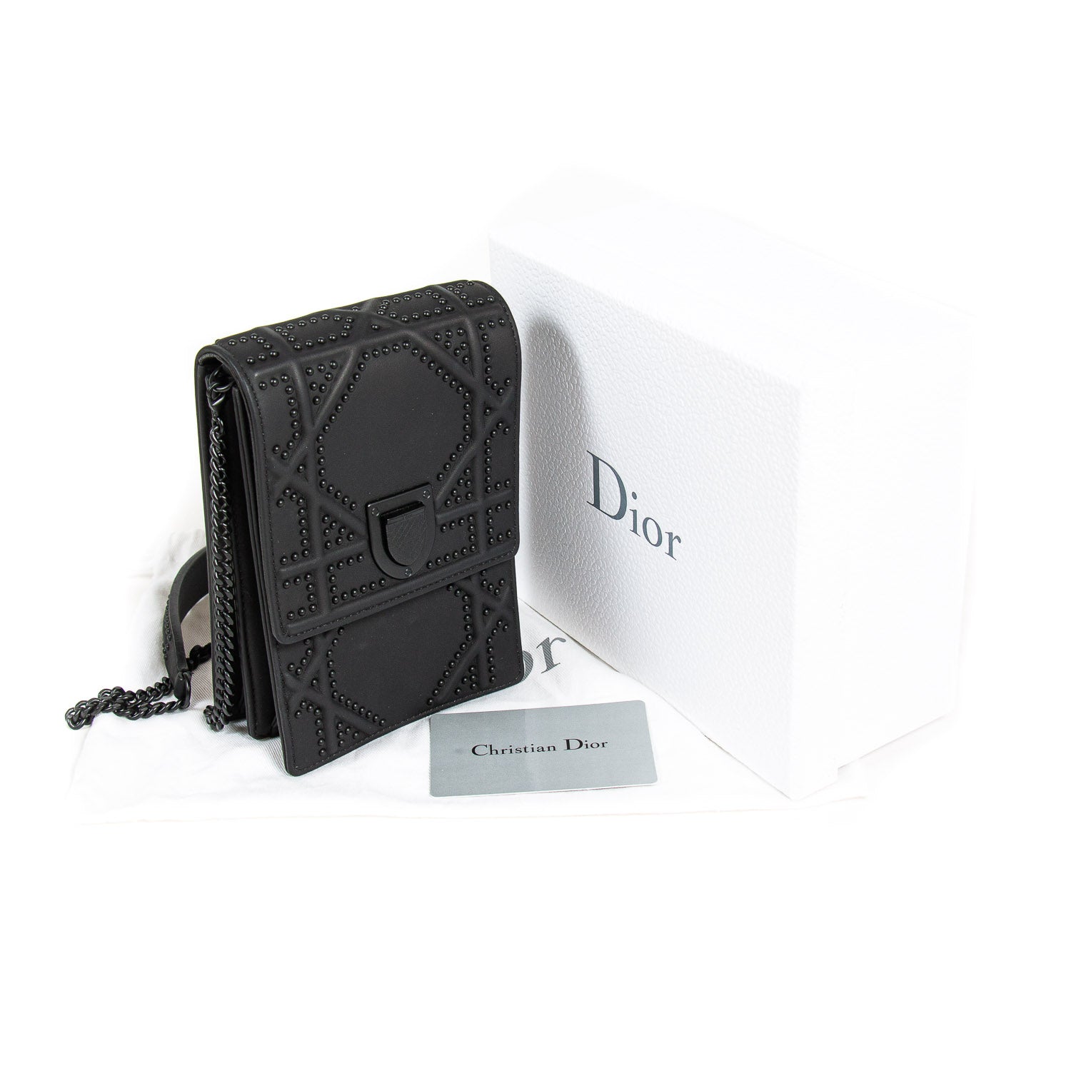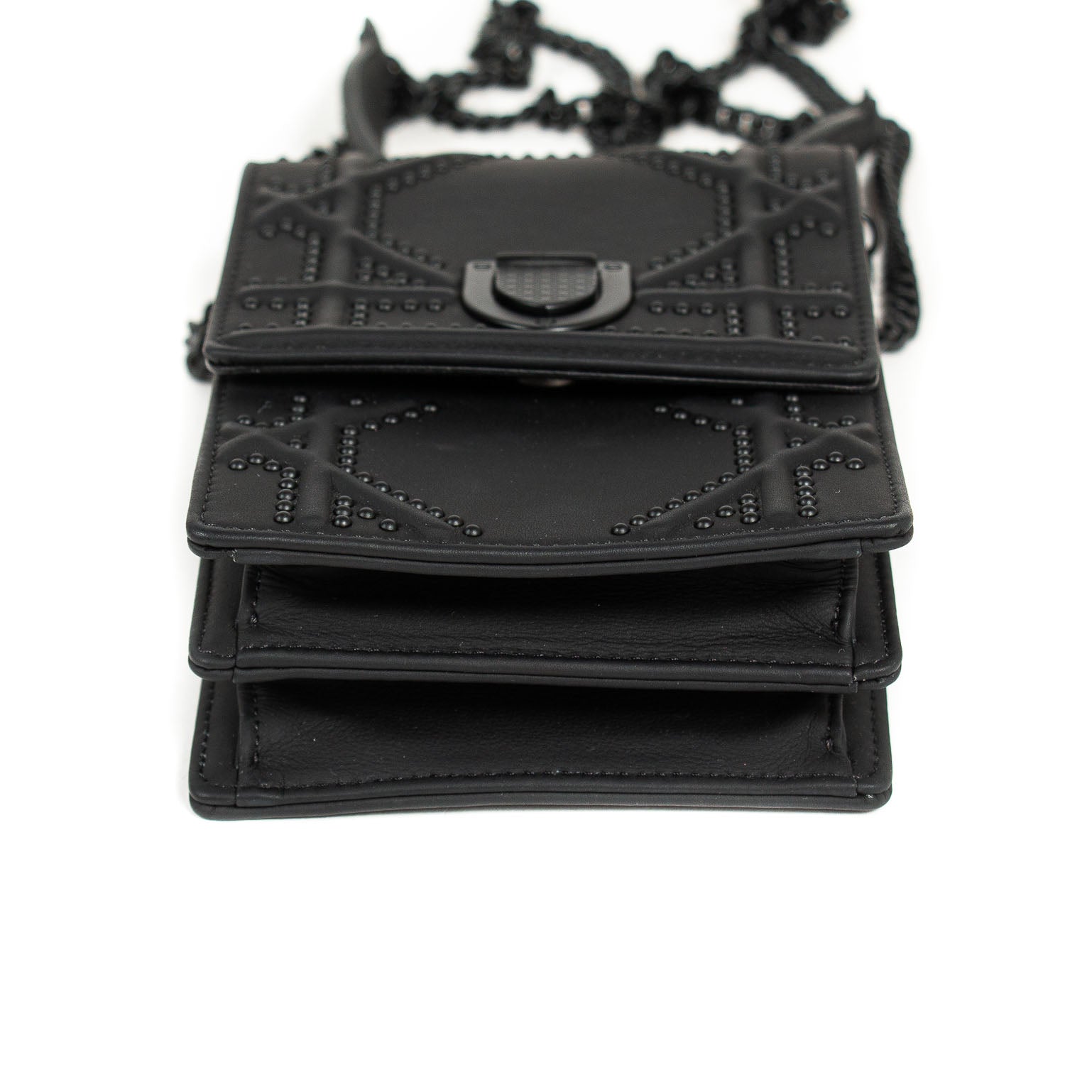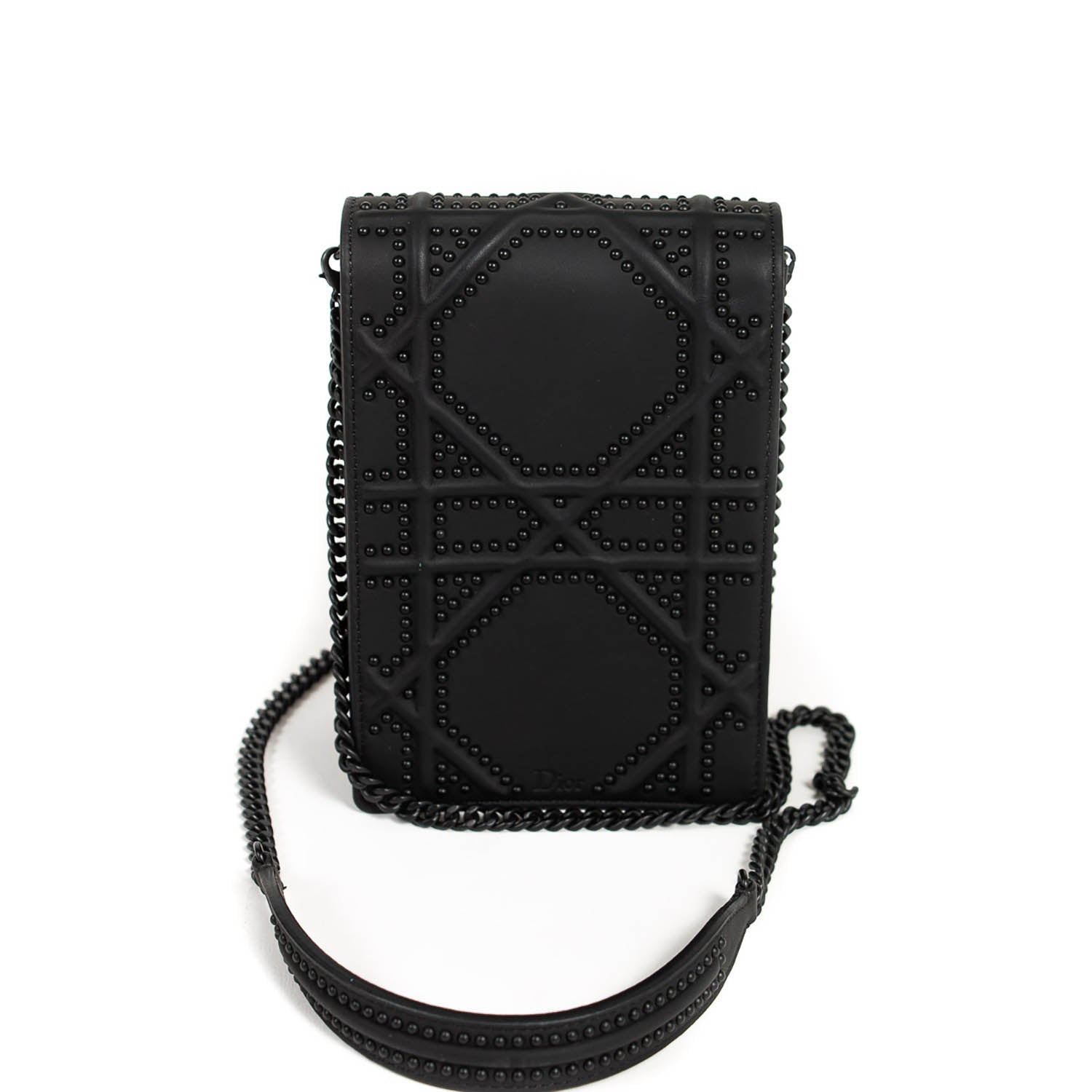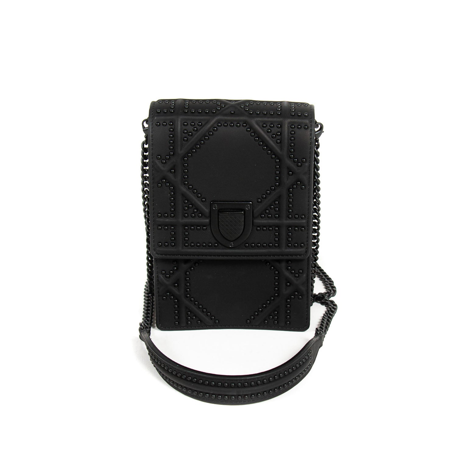 Details: Black Embossed Calfskin Leather / Black Hardware / Detachable Chain with Leather Pad Shoulder Strap / Studs Throughout the Exterior / Black Suede Interior Lining / Dual Slit Pocket at Interior / Magnetic Closure at Front Flap