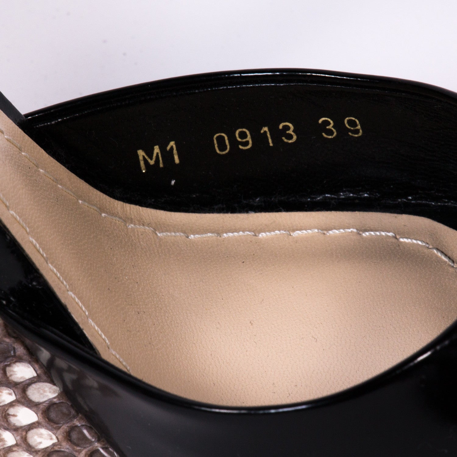 Details: Escapade Black Patent Leather / Strappy Wedge / Inside Leather Lining / Tonal Stitching Throughout / Gold Tone Buckle At Ankle / Python Skin Covered Wedge