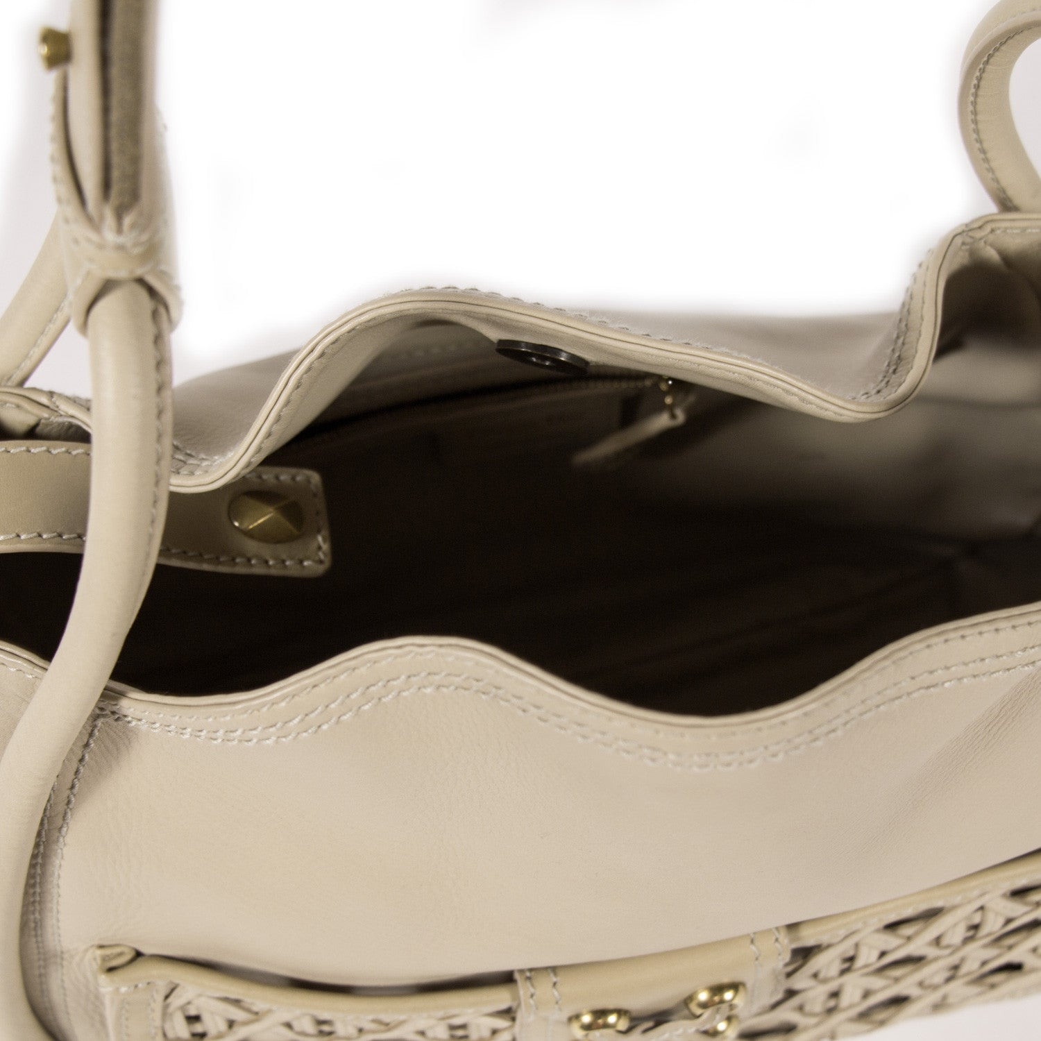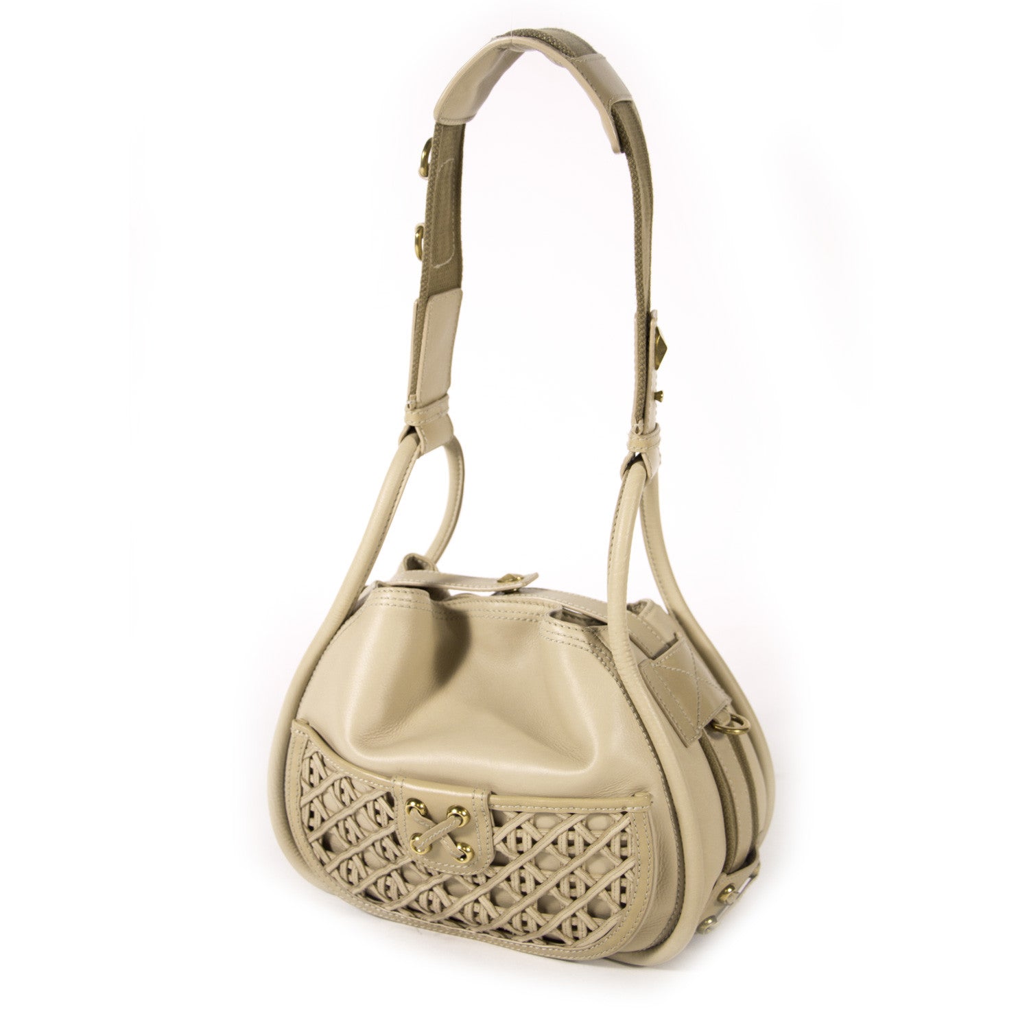 Details: Beige Calfskin Leather / Brass Hardware / Tonal Stitching / Grey Woven Accent At Base And Edges / Dual Rolled Handles / Detachable Adjustable Shoulder Strap With Metal / Exterior Pocket At Front With Snap Closure / Leather Interior Lining / Dual Pockets One With Zip Closure / Snap Closure At Top