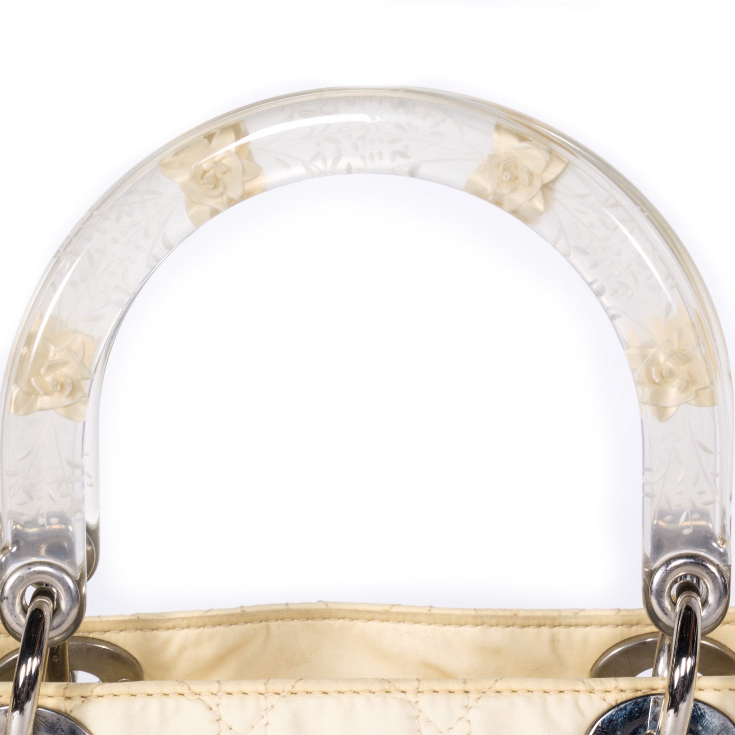 Details: Beige Cannage Nylon / Silver Tone Hardware / Dual Resin Rolled Handles With Flower Embellishment / Detachable Shoulder Strap / Brown Woven Interior Lining / Zip Closure Pocket At Interior Wall / Zip Closure At Top
