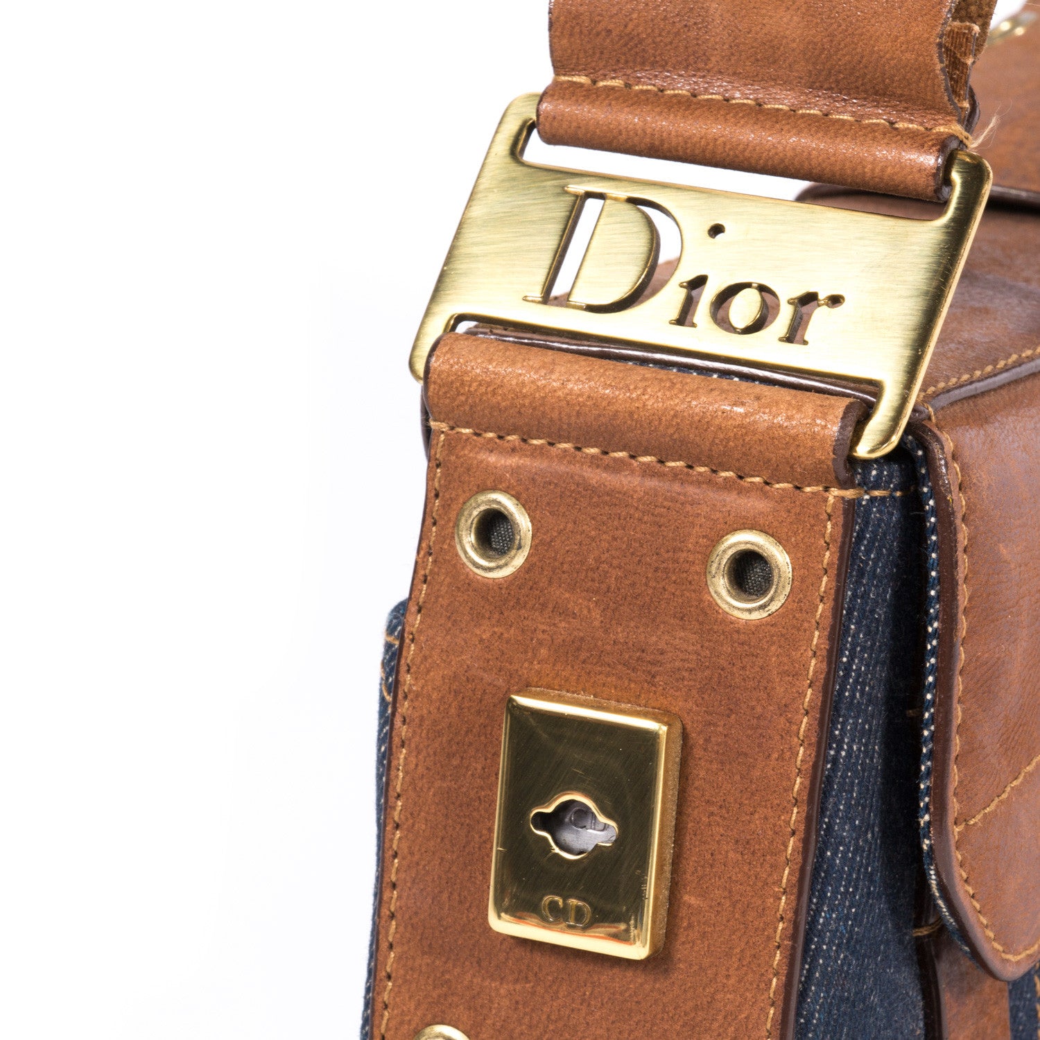 Details: Denim Fabric with Brown Leather / Gold-Tone Hardware / Adjustable Shoulder Strap / Metal Plate Logo at Front / Black Fabric Interior Lining / Zipper Pocket at Inside / Magnetic Flap Closure at Front