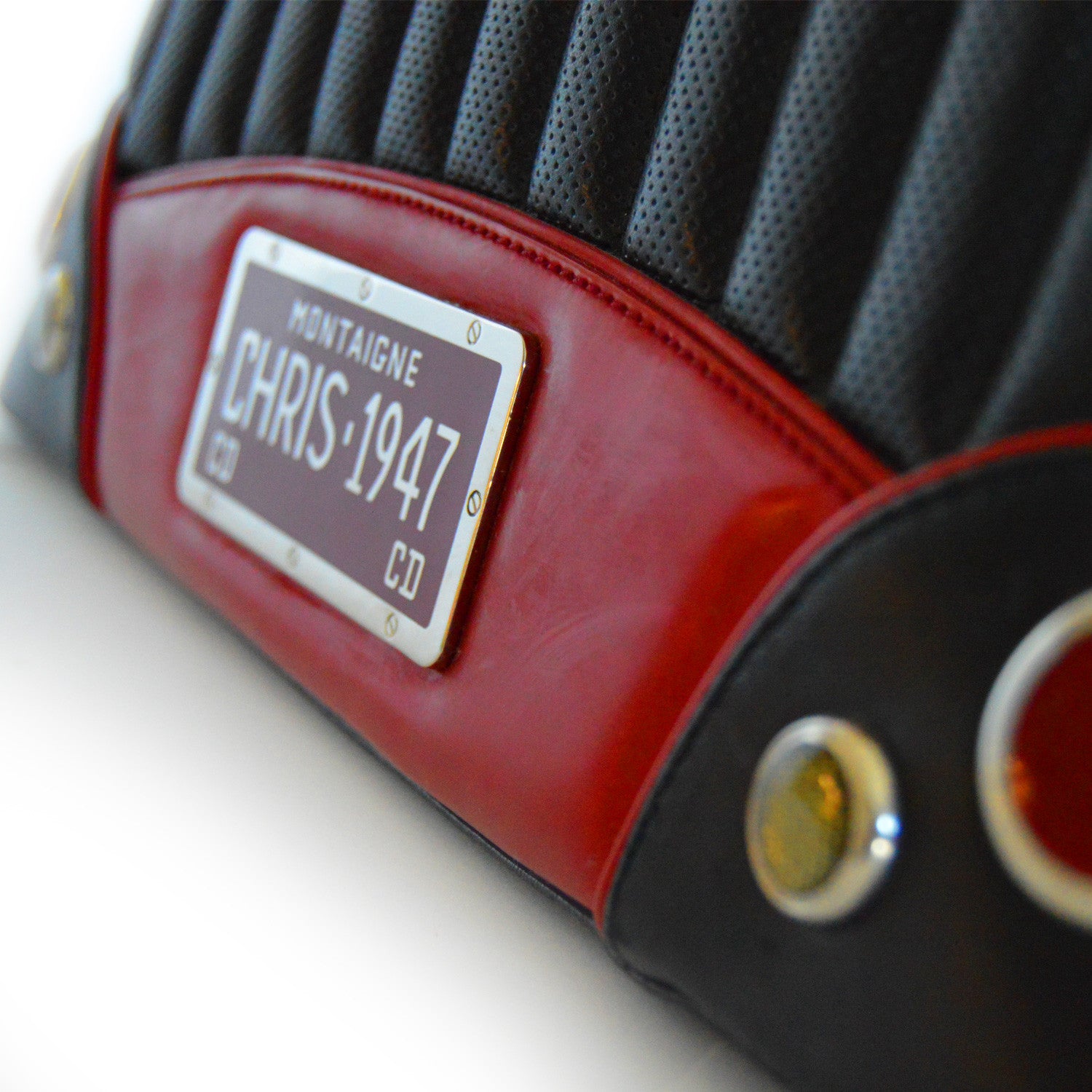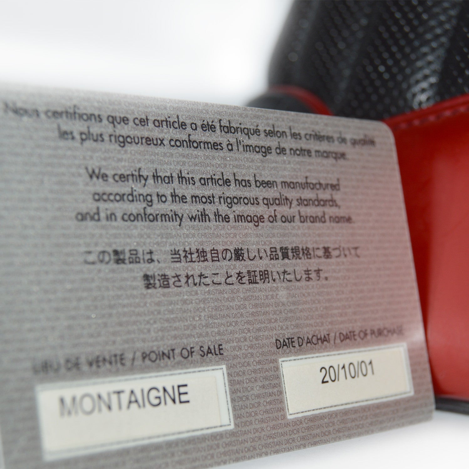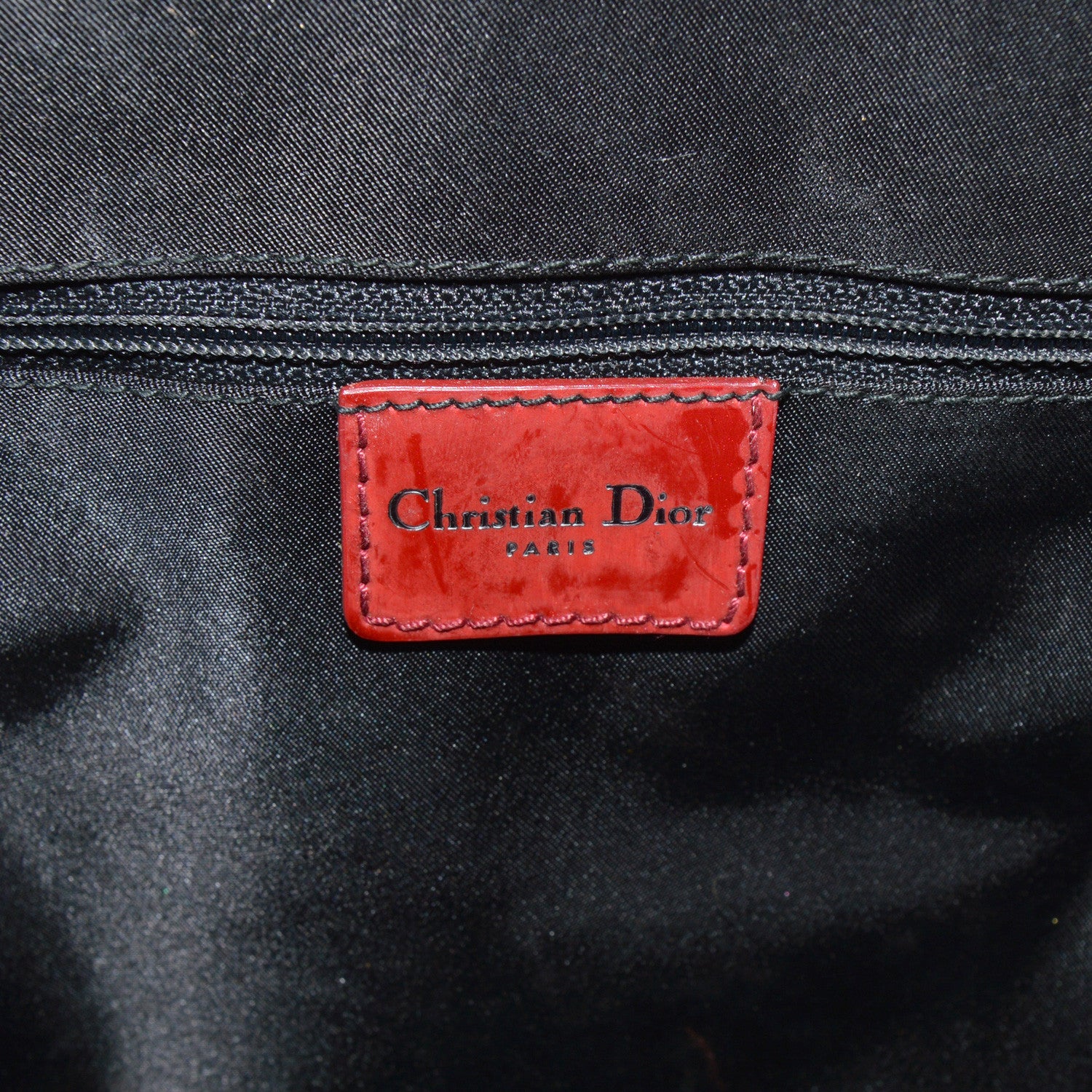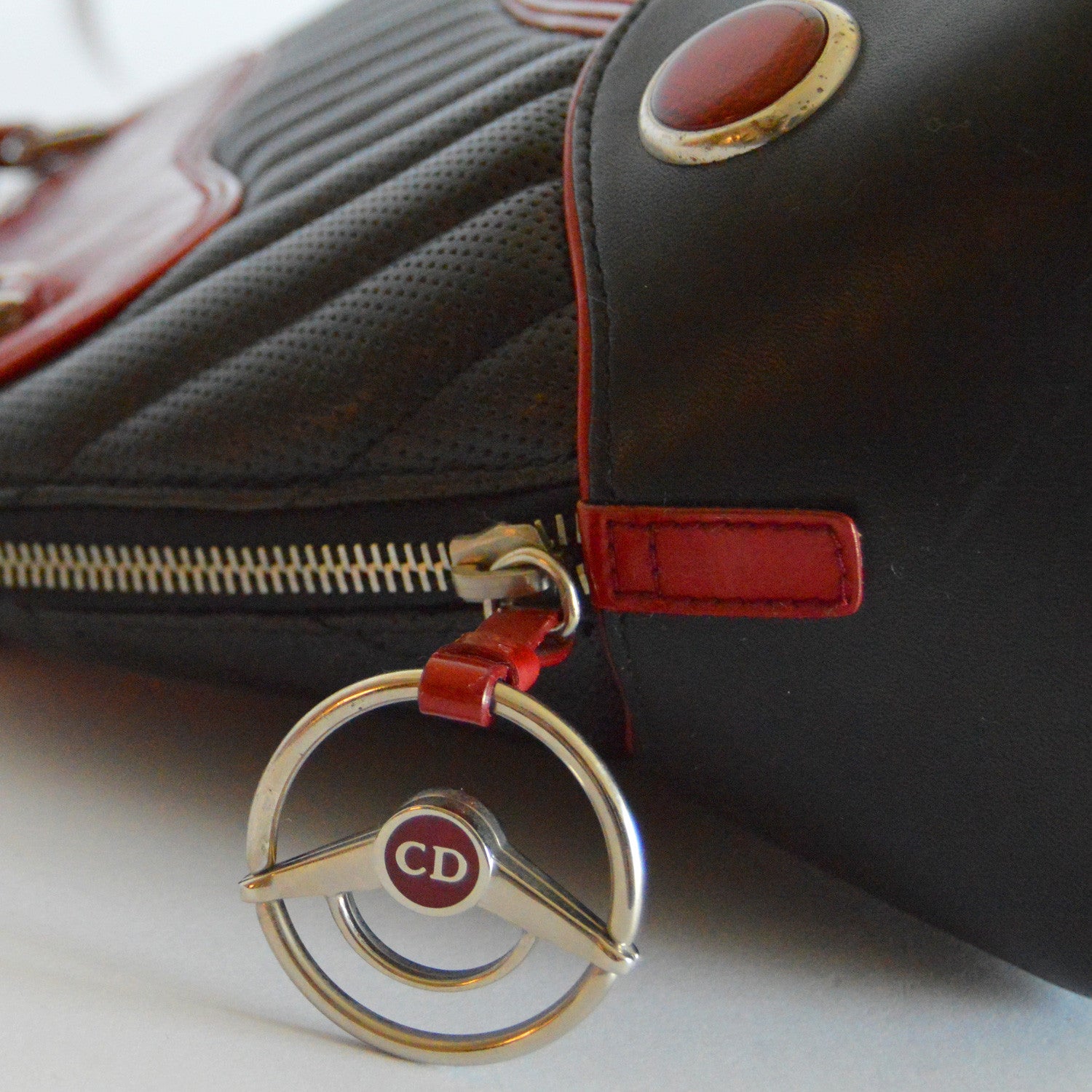 Details: Black Perforated Leather And Red Patent Leather / Silver-Tone Hardware / Tonal Stitching Throughout / Signature License Plate Detail / Automobile Hood Ornament-Inspired Key Chain / Dual Rolled Handles / Black Interior / Double Pockets At Interior Walls: Snap Closure And Zip-Around Closure