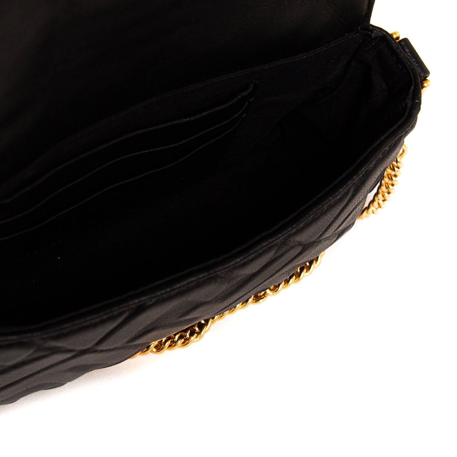 Details: Black Nappa Leather / Gold-Tone Hardware / Embossed FF Logo Throughout / Detachable Leather Handle and Shoulder Strap / Fabric Interior Lining / 3 Card Slots / Magnetic Snap Closure at Front Flap