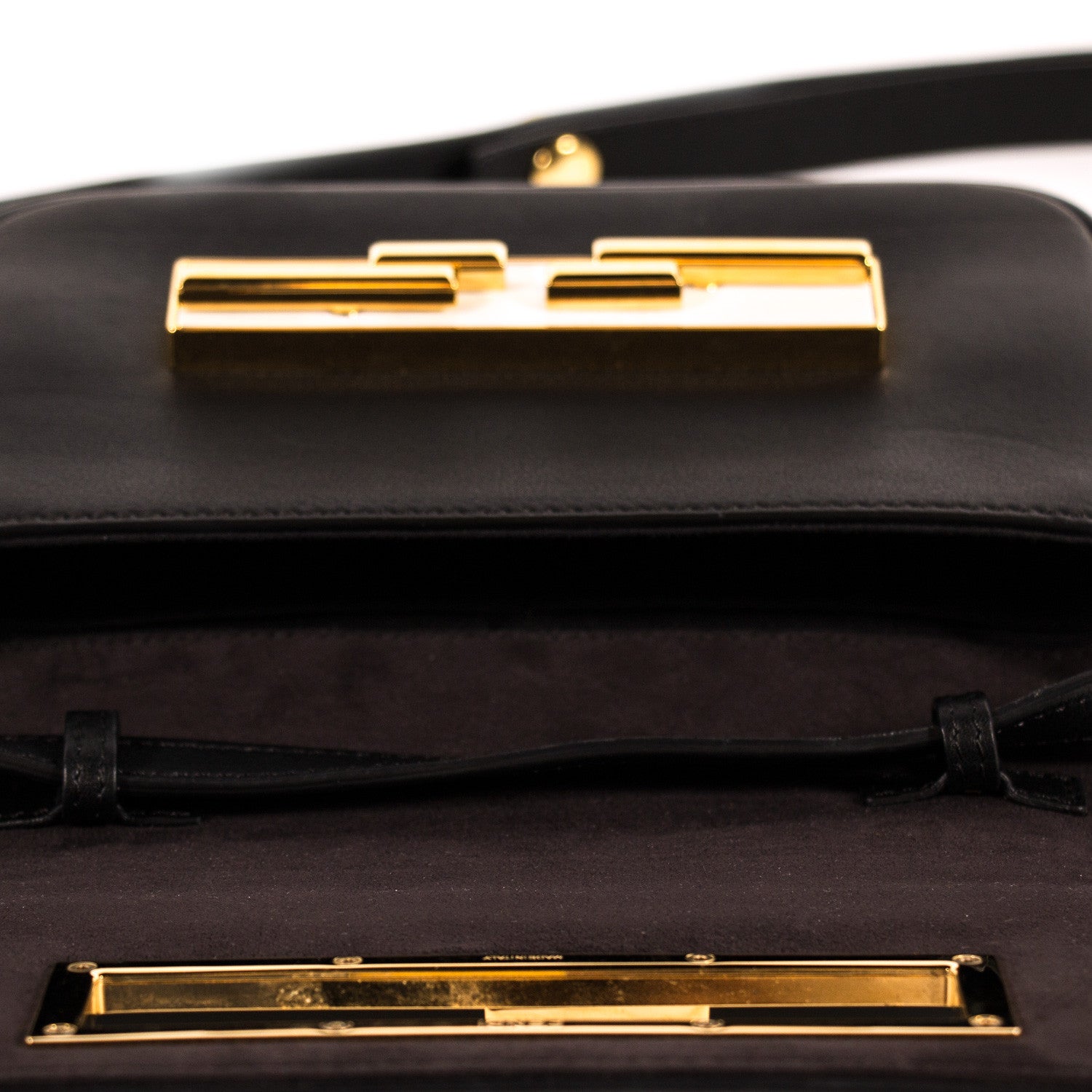 Details: Black Calf Leather / Gold-Tone Hardware / Single Adjustable Shoulder Strap / Black Fabric Lining At Interior Compartment / Black Suede At Interior Flap / Dual Flat Pocket At Interior / Dual Turn-Lock Fastening At Front