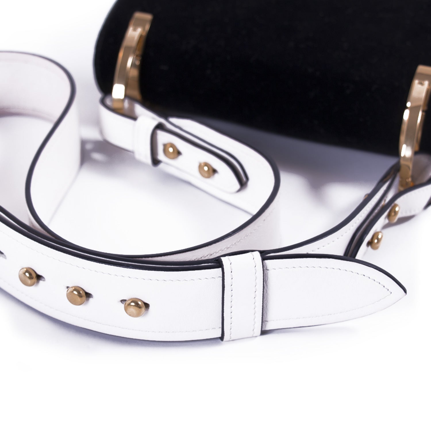 Details: Black Velvet / Gold-Tone Hardware / White Leather Adjustable Shoulder Strap / Logo at Front Face / Black Leather Lining / Single Compartment / Slit Pocket at Inside / Magnetic Button Closure at Front