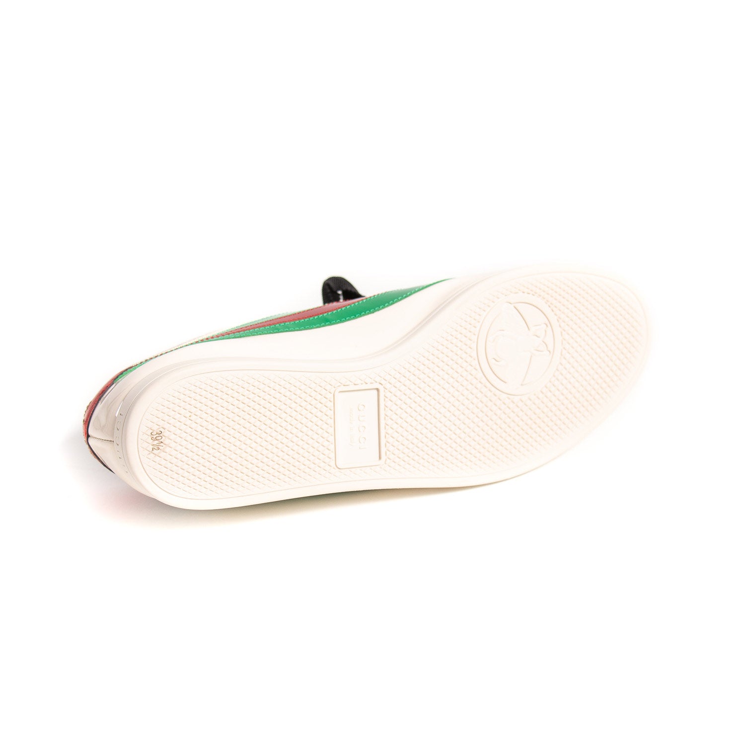 Details: Ivory Patent Leather / Low Top Sneaker / Green and Red Web Detail on Both Sides / Embellished Logo with Multicolor Crystal at Top / Lace-Up Closure