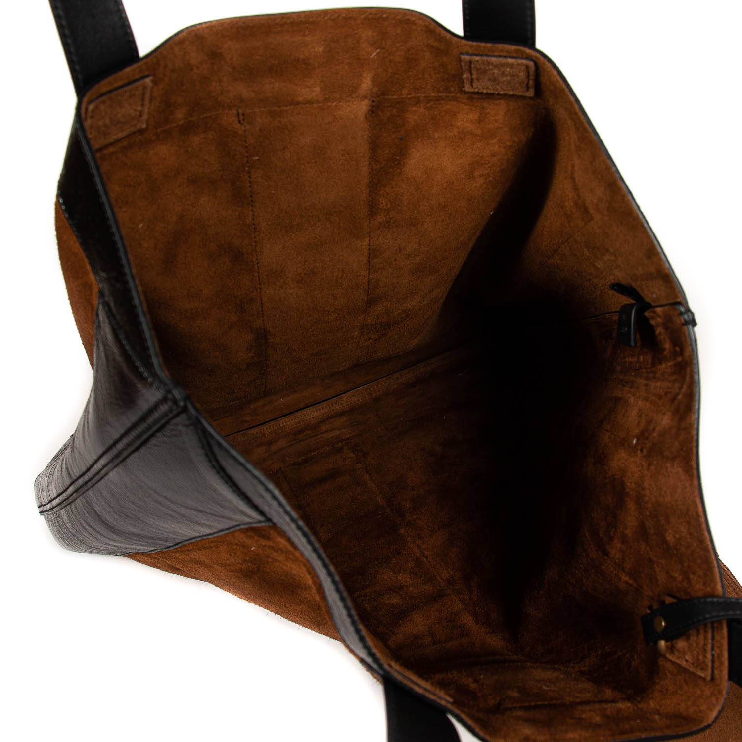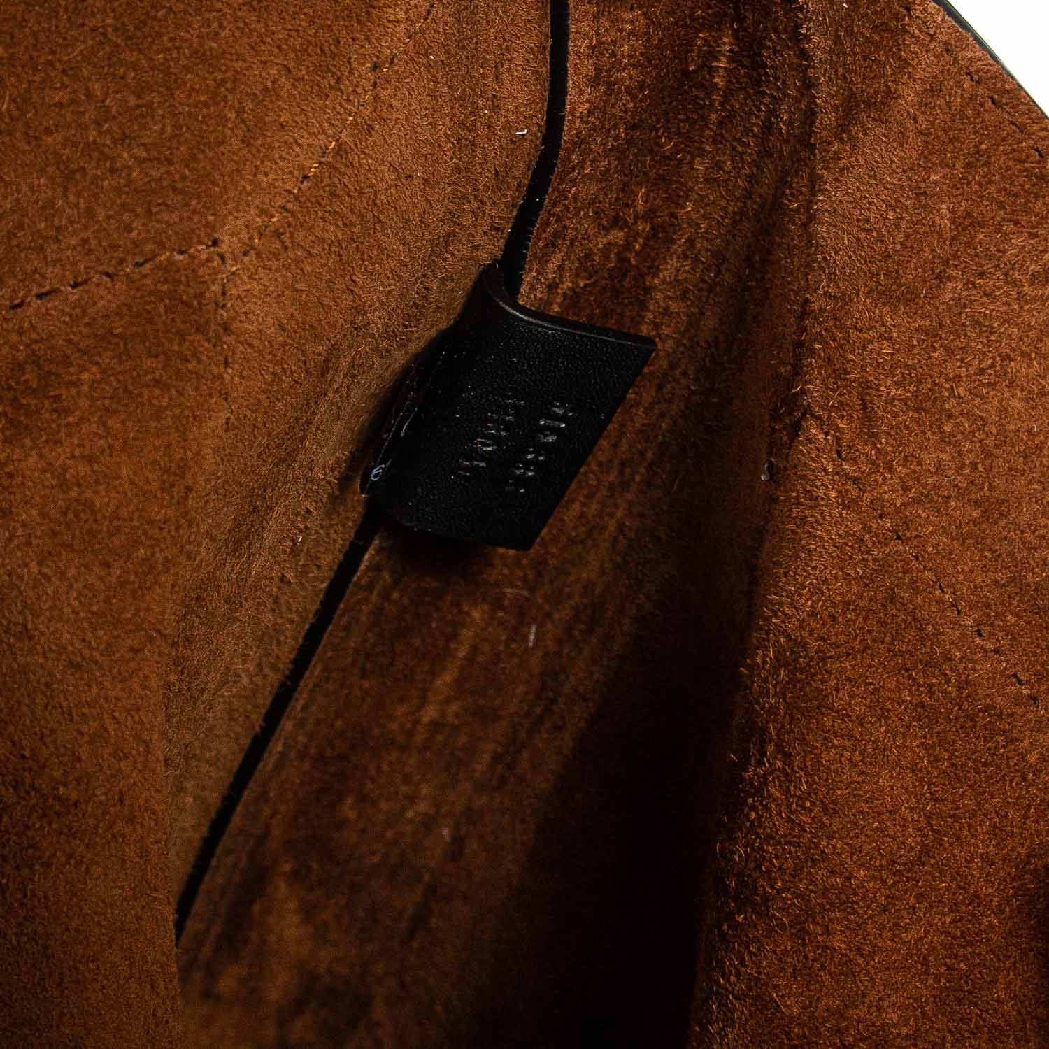Details: Brown Suede / Red and Green Stripe / Black Patent Leather Trim / Brass Hardware / Dual Shoulder Strap / Brown Suede Lining / Open Top / Detachable Pouch