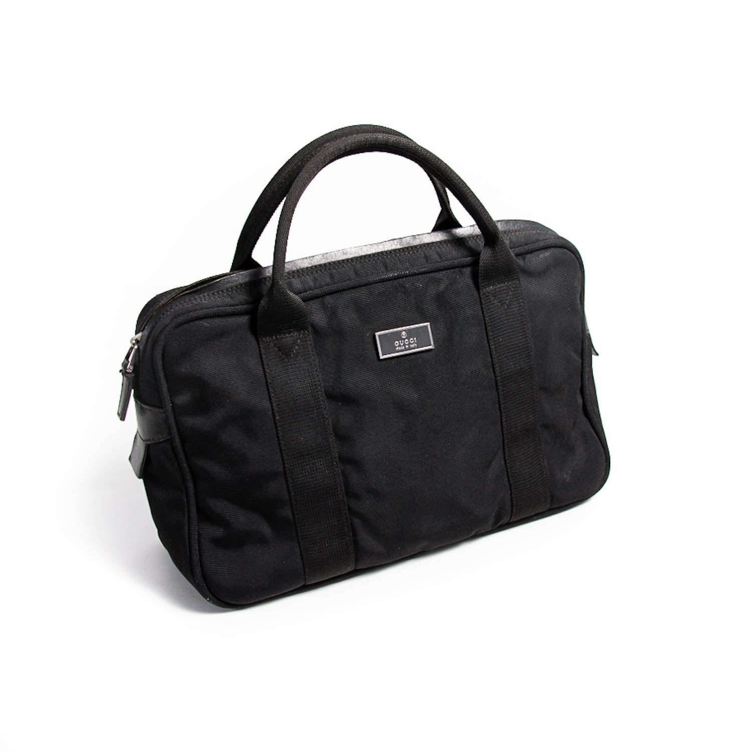 Details: Black Nylon and Canvas / Silver-Tone Hardware / Dual Rolled Handles / Logo at Front / Woven Interior / Zipper Pocket at Inside / Zipper Closure