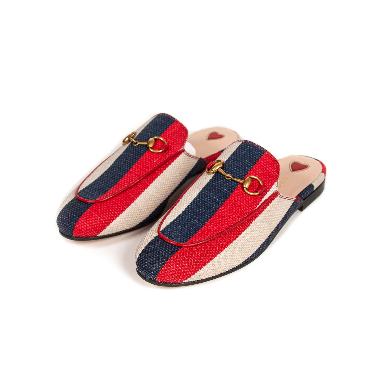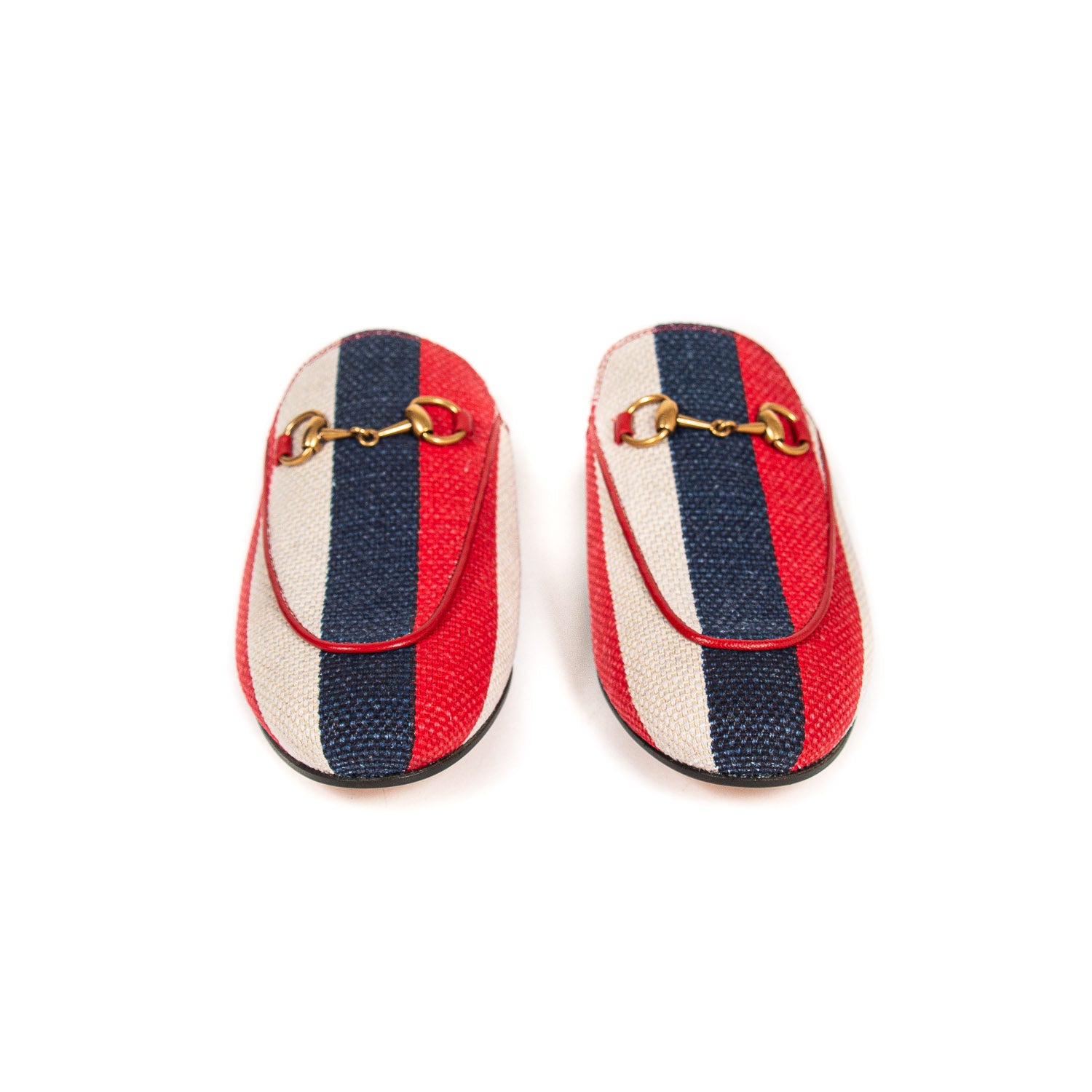 Details: Beige, Blue and Red Stripes / Round Toes / Horse-bit Accent at Top