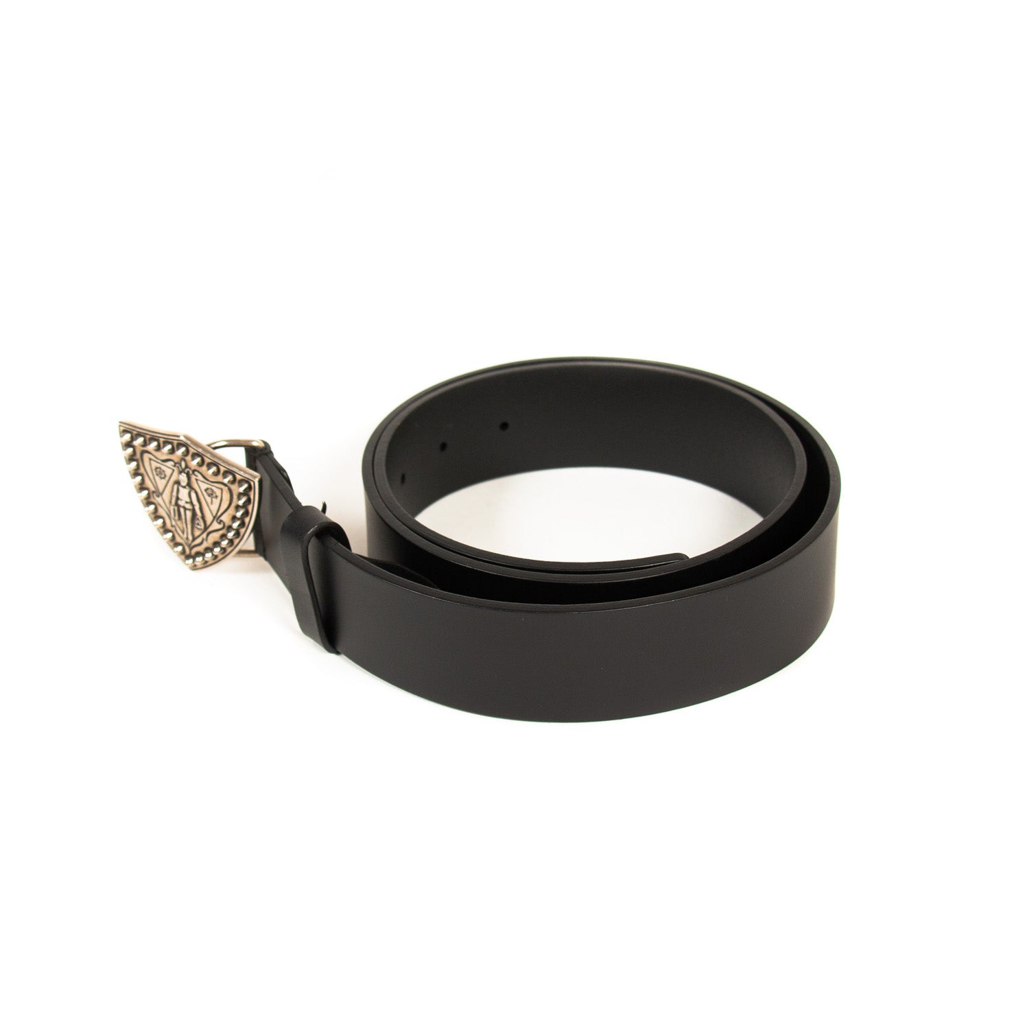 Details: Black Leather / Antique Silver-Tone Hardware / Black Leather Trim / Shield Buckle with Studs at Front