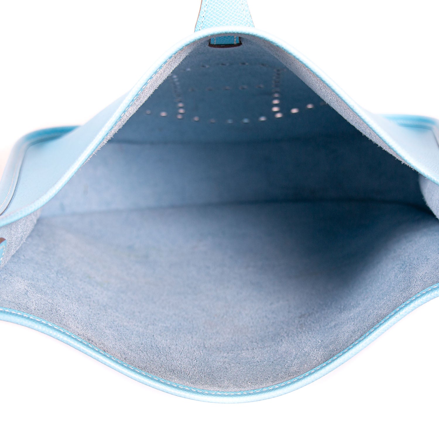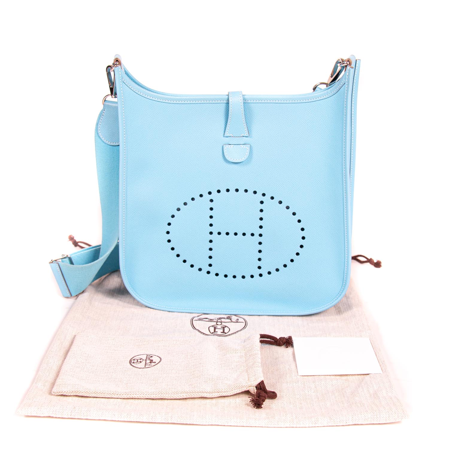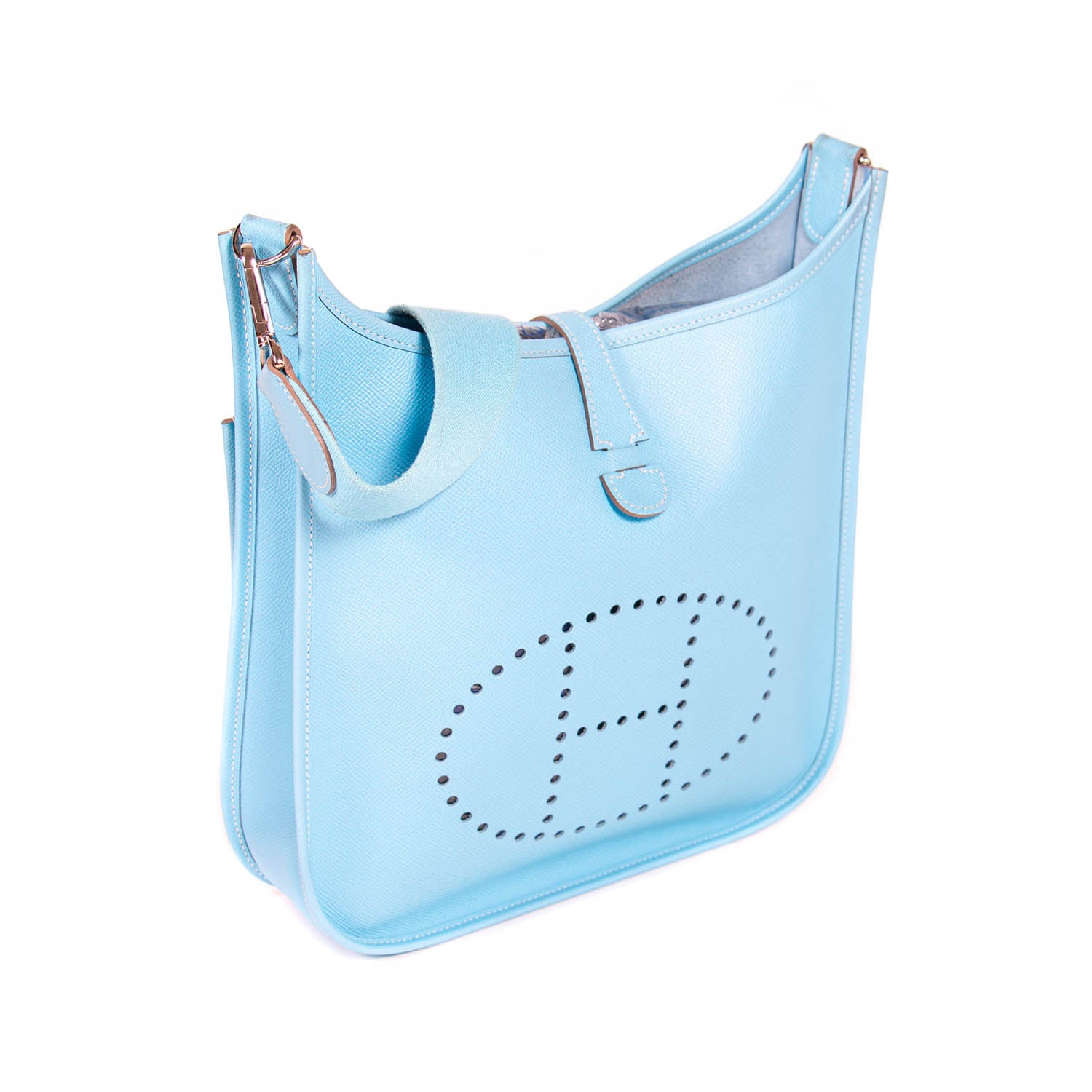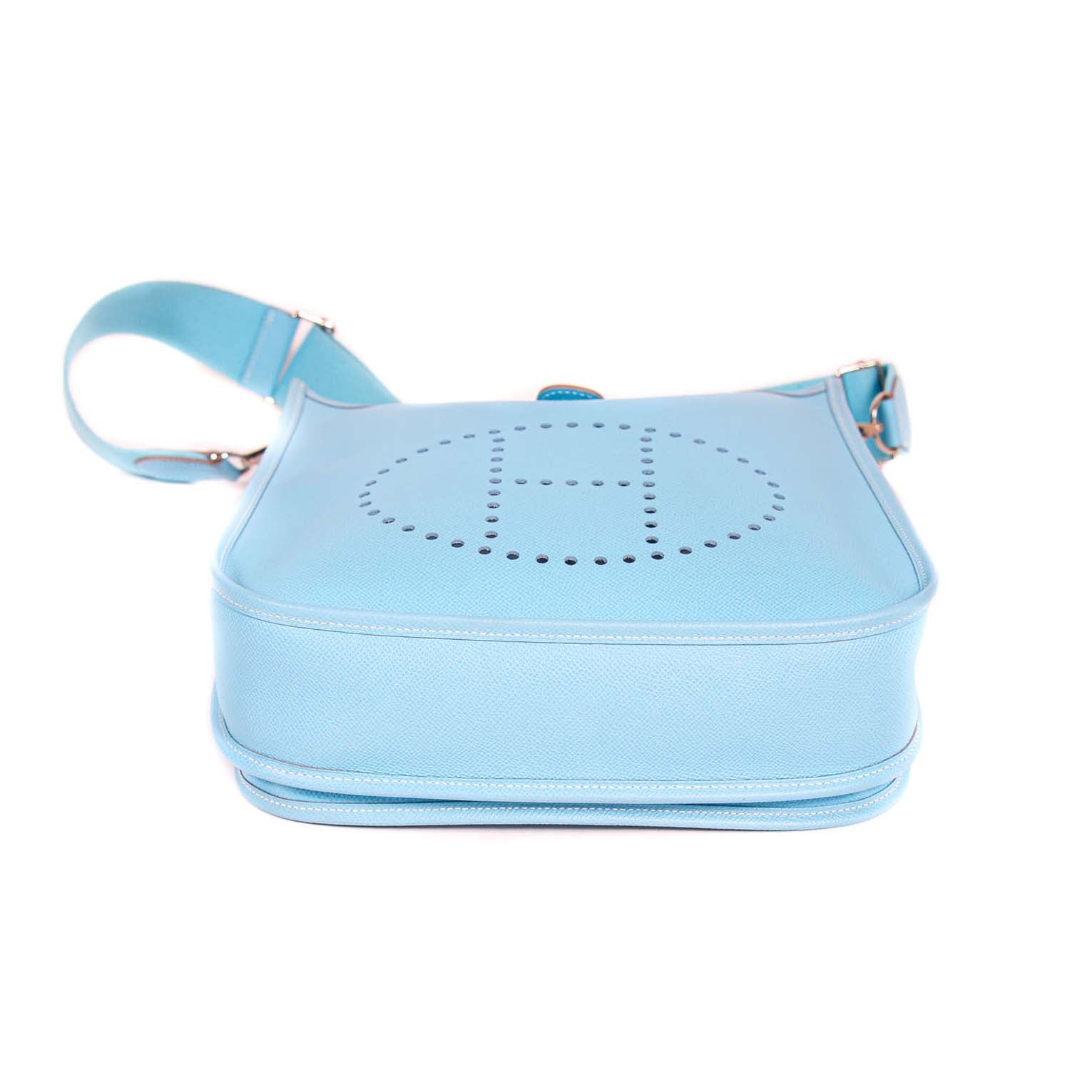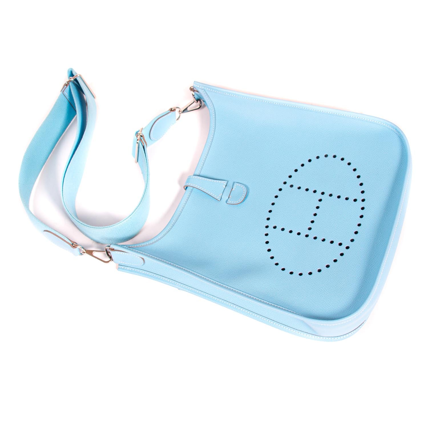 Details: Sky Blue Epsom Leather / Palladium Hardware / Detachable and Adjustable Shoulder Strap / Exterior Pocket at Back / Perforated H Logo at Front / Suede Interior Lining / One Compartment / Push Lock Closure