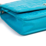 Details: Blue Lambskin Leather / Silver Tone Hardware / Chain-Link and Leather Shoulder Strap / Logo at Front Face with Embossed Flower and Logo / / Dual Compartments, One with Zipper Closure / Six-Card Slots / Snap Closure at Front Flap