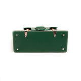 Details: Green Leather and Multicolor Coated Canvas / Silver-Tone Hardware / Wooden Top Handle and Trim / Marigold Canvas Lining / Single Zipper pocket at Inside / Fold-in Flap Closure at Front