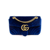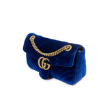 Details: Dark Blue Velvet / Antique Gold-Tone Hardware / Chain-Link and Leather Pad Shoulder Strap / Double G Logo at Front / Satin Interior Lining / Zipper Pocket at Inside / Push Button Flap Closure at Top