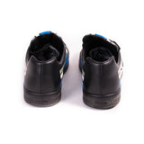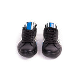 Details: Black Leather / Rounded Tote / Black Rubber Sole / White, Grey and Blue Print Accent