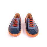 Details: Navy Blue Leather and Suede Top / Rounded Tote / Orange Rubber Sole
