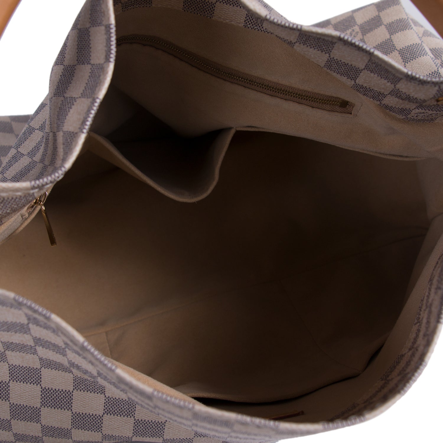 Details: Grey and White Damier Azur Coated Canvas / Gold-Tone Hardware / Single Rolled Top Handle / Protective Studs at Base / Micro-Fiber Interior Lining / Seven Pockets at Inside, One with Zipper Closure / Open Top