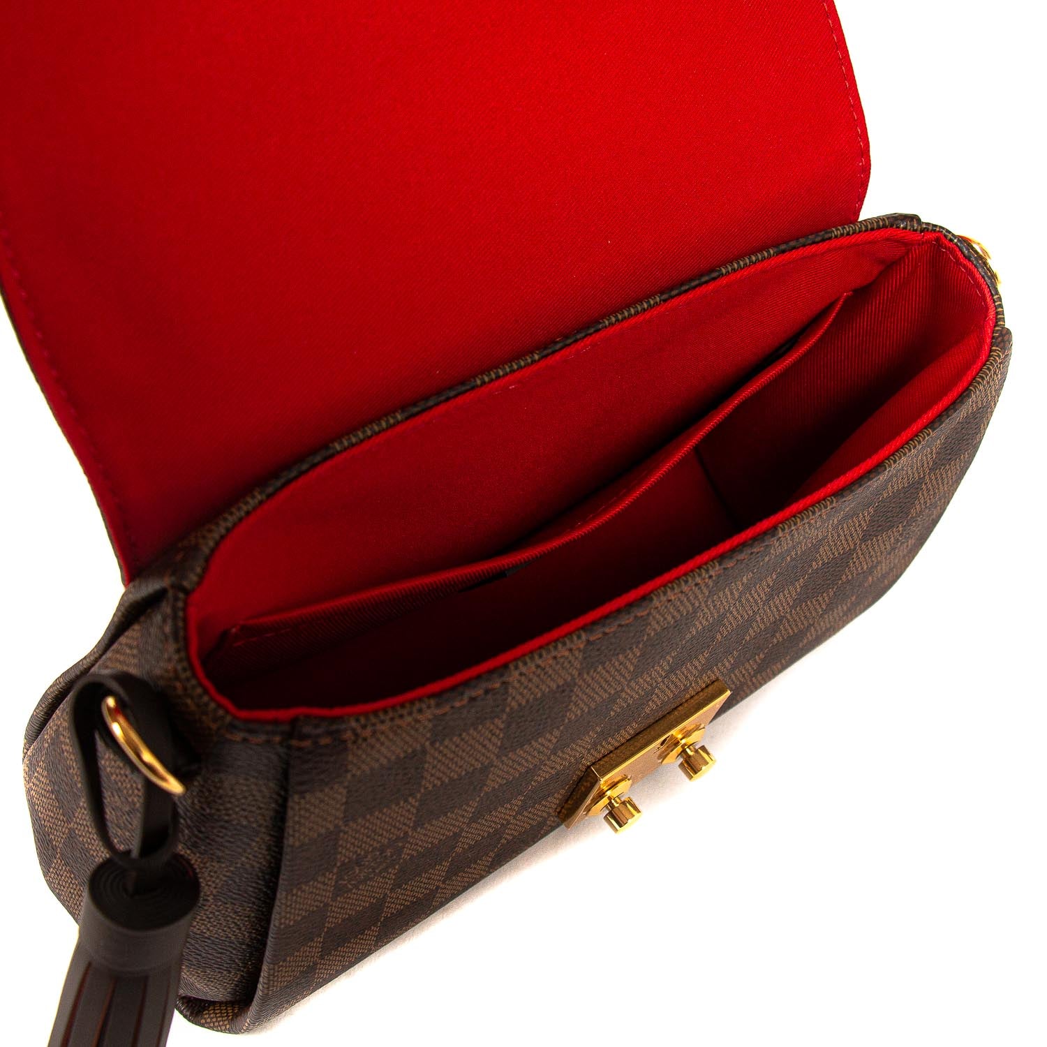 Details: Brown Damier Ebene Coated Canvas / Gold-Tone Hardware / Single Rolled Handles / Detachable Shoulder Strap / Red Fabric Lining / Interior Slit Pocket / S-Lock Closure at Front Flap
