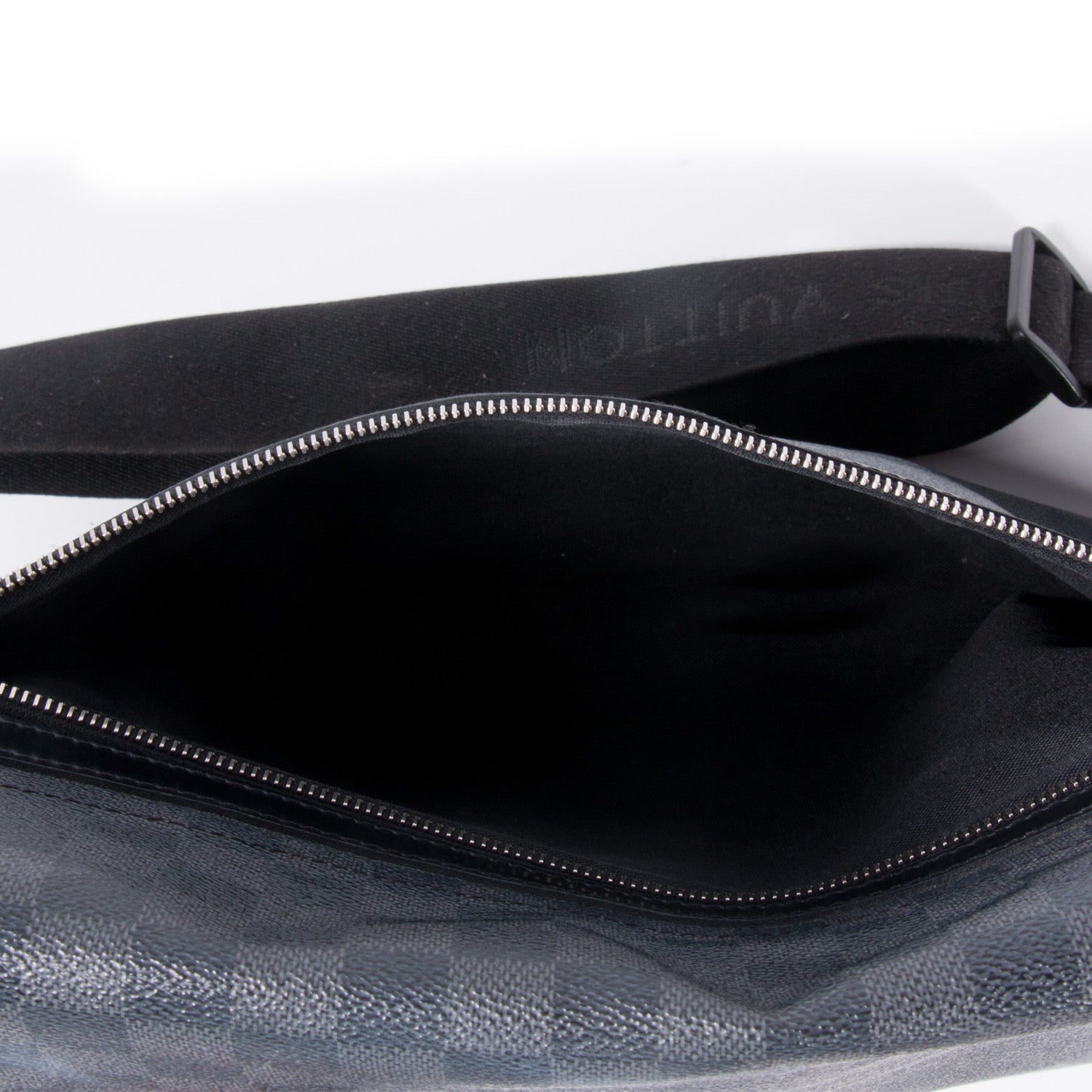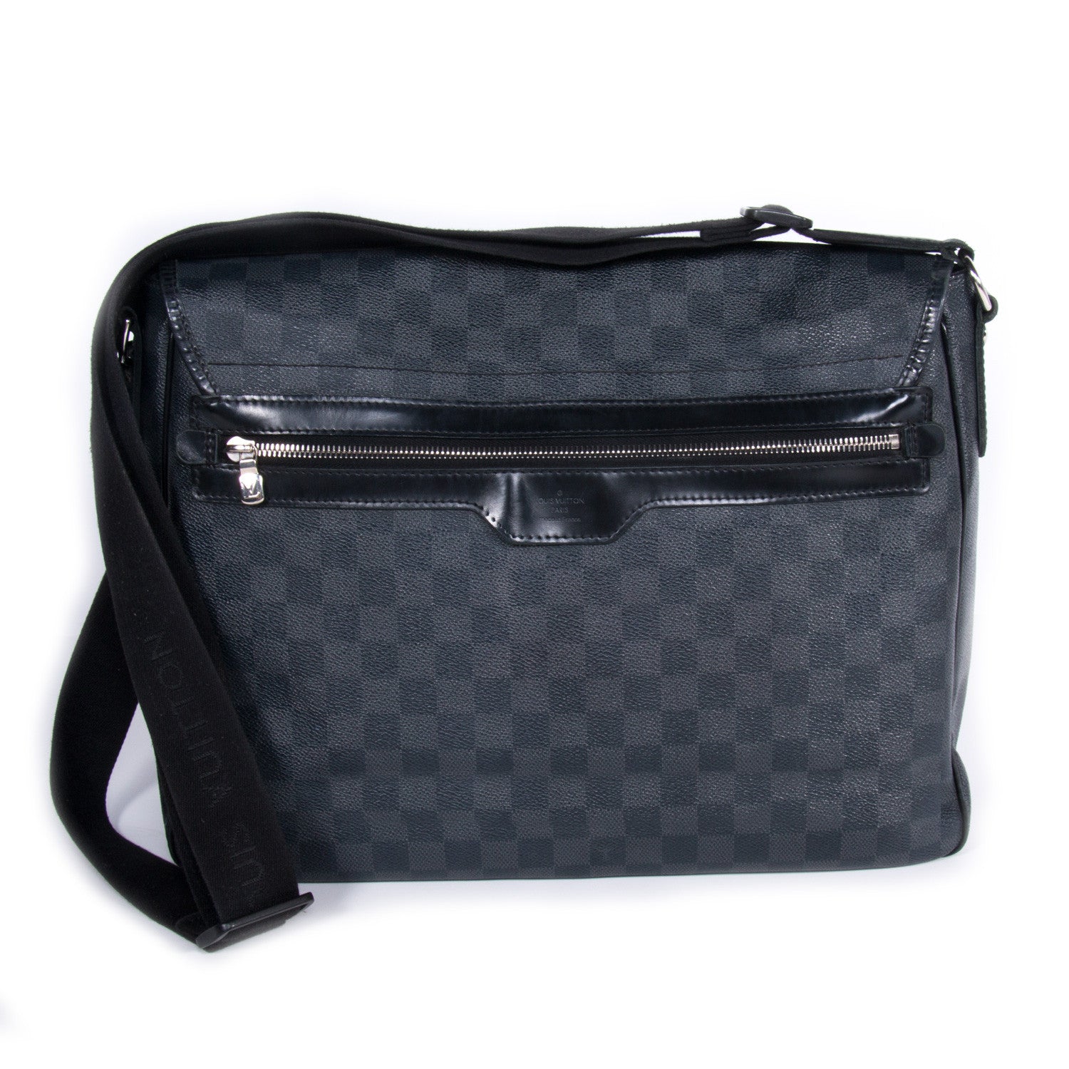 Details: Black And Grey Men Messenger Bag In Damier Graphite Coated Canvas Leather / Black Leather Trim / Silver Tone Hardware / Zip Pocket At Exterior Pocket / Woven Adjustable Shoulder Strap / Woven Interior Lining / Large Slit Pocket Underlay / Single Large Compartment With Two Interior Small Pockets / Magnetic Snap Closure At Interior