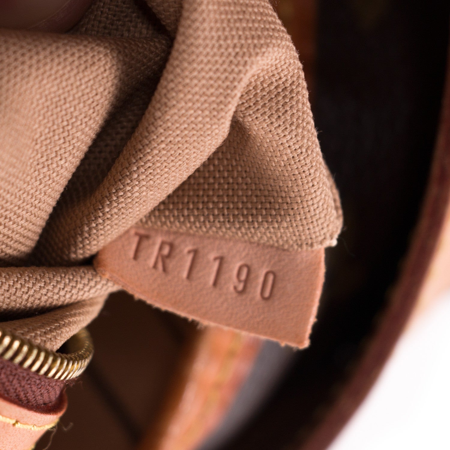 Details: Brown And Tan Monogram Coated Canvas / Brass Hardware / Tan Vachetta Leather Trim / Single Shoulder Strap / Single Compartment / Single Zip Pocket At Interior / Beige/Brown Striped Canvas Lining / Clasp Closure At Top