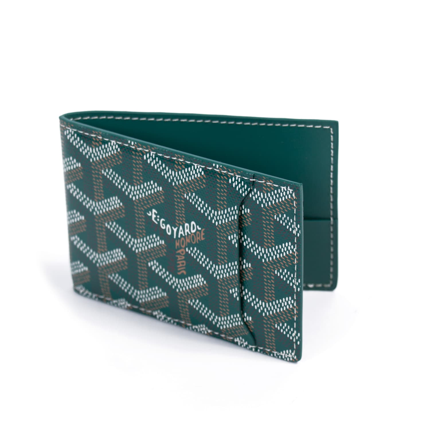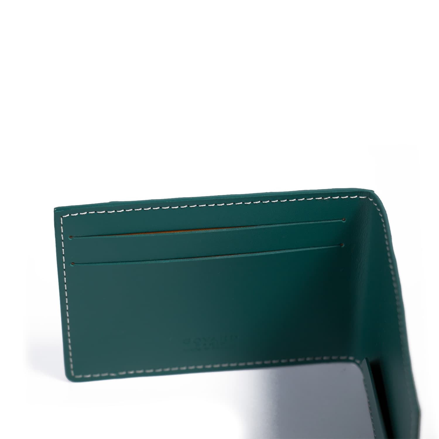Details: Green, White and Brown Goyardine Coated Canvas / White Stitching / Green Interior Leather / 3 Card Slots / Exterior Slit Pocket at Front