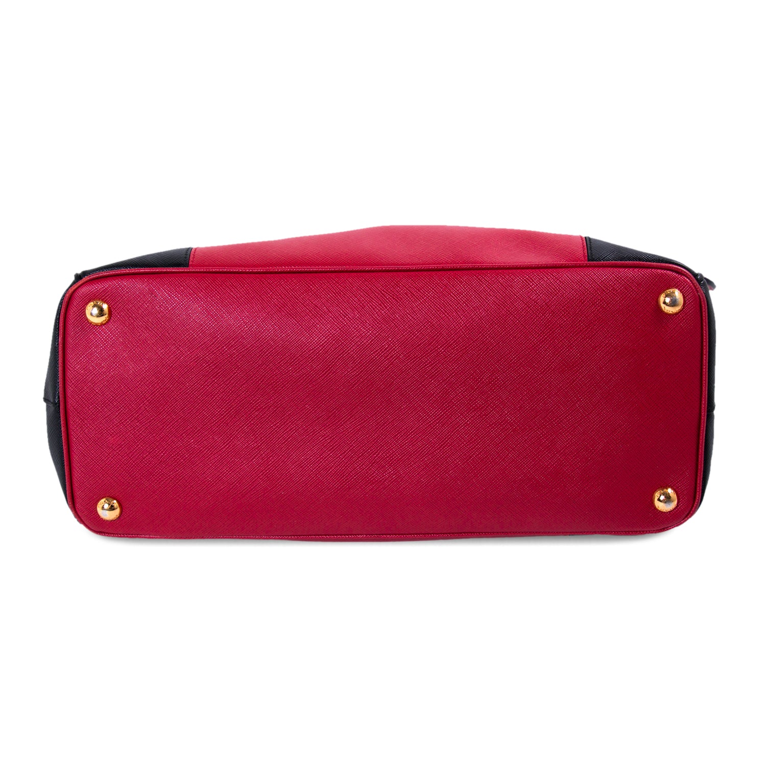 Details: Black and Red Saffiano Leather / Gold-Tone Hardware / Dual Rolled Handles / Black Jacquard Interior Lining / Three Compartments, Two with Zipper Closure / Flat and Zip Pocket at Inside