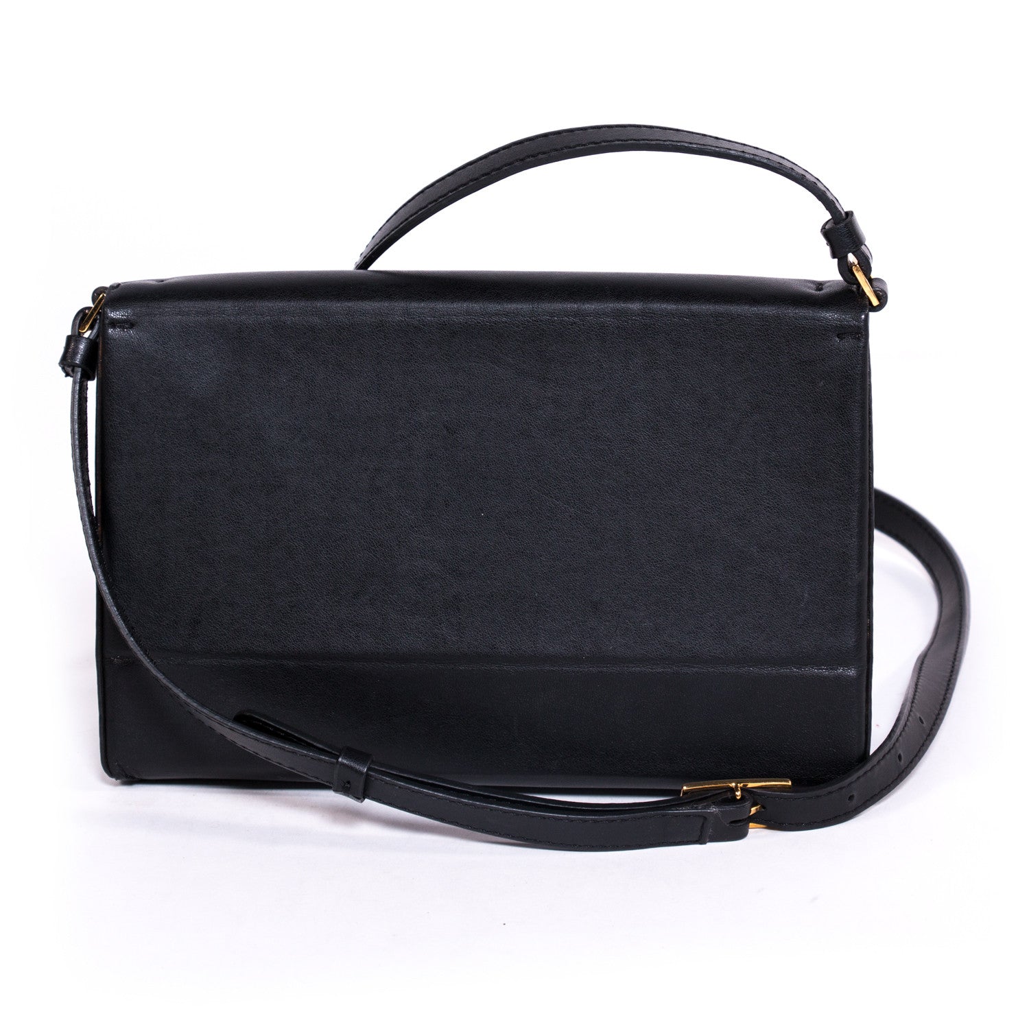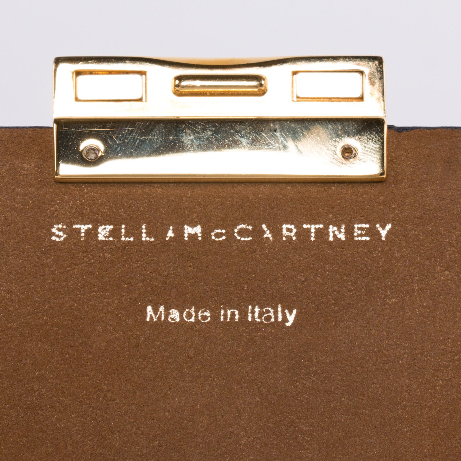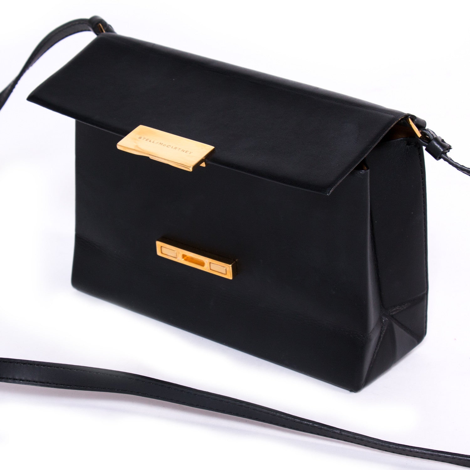 Details: Black Synthetic Leather / Double Carried Shoulder Or Cross Body / Adjustable Shoulder Strap / Flap Magnetic Press Closure / Gold Tone Hardware / Brown Interior Suede / Stamped Stella McCartney Made In Italy On The Inside