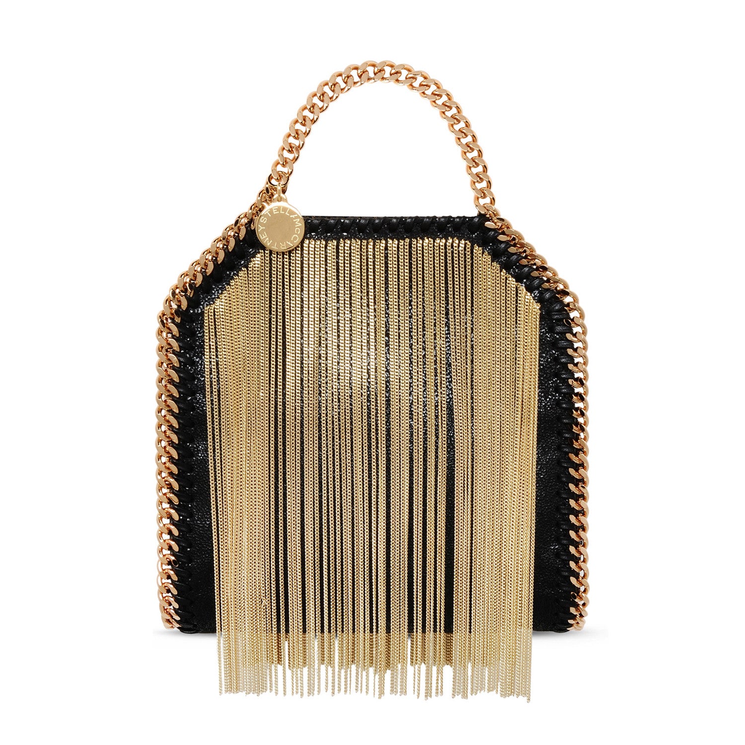Details: Falabella Shaggy Deer Tiny Tote / Black With Gold Chain Fringing / Diamond Cut Gold Chain Trim and Handles / Magnetic Snap Closure / Pink Interior is Lined with Stella McCartney Logo Print Recycled Polyester.