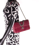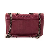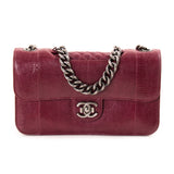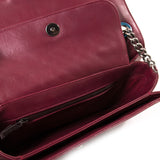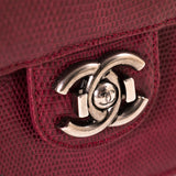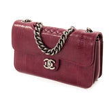 Details: Exotic Burgundy Lizard Leather / Antique Silver Hardware / Small Chain Handle / Chain Shoulder Strap with Leather Pad / Exterior Slit Pocket at Back / Leather Lining at Interior / Three Compartments One with Snap Closure / Zipper Pocket at Inside Wall / CC Push Button Closure at Front Flap